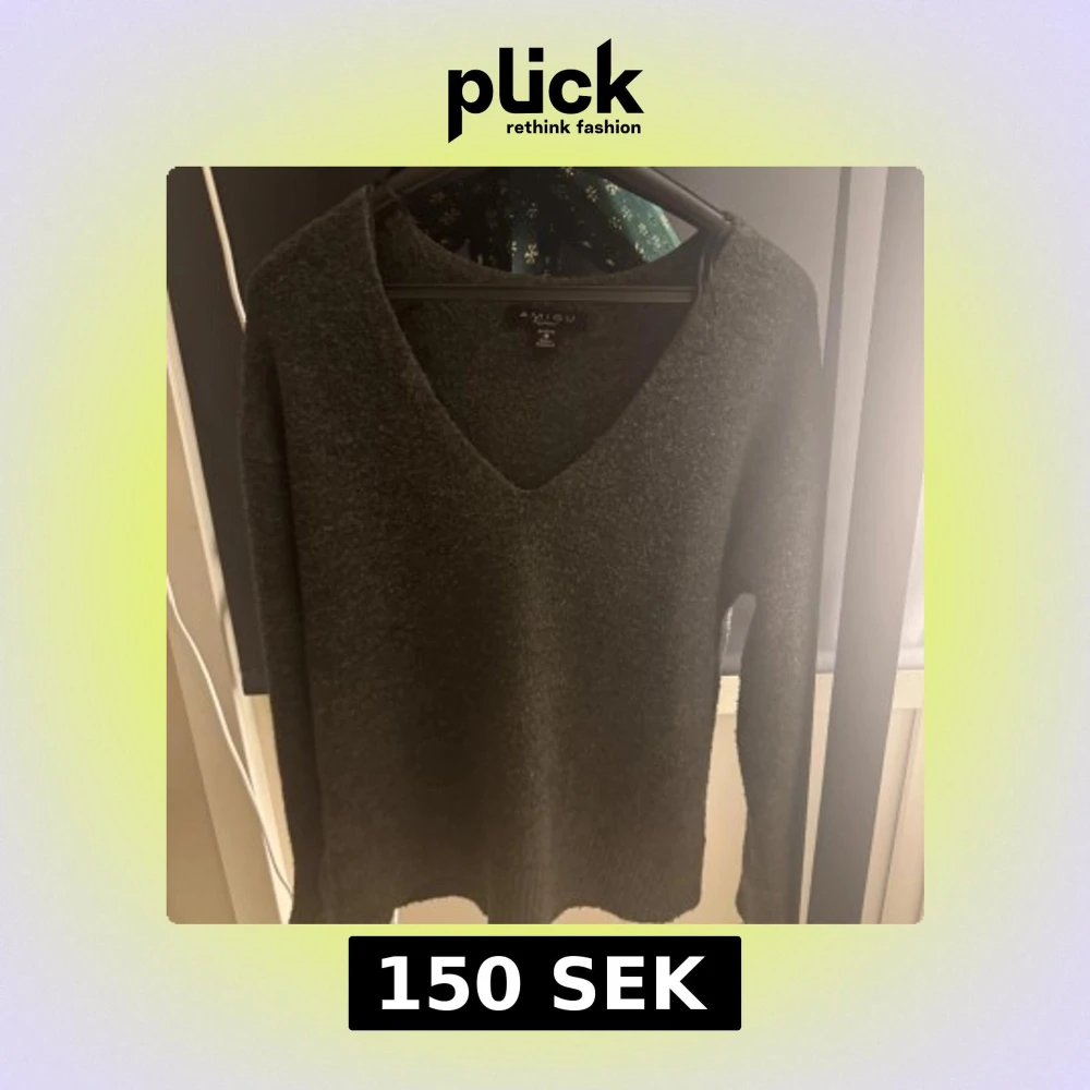Säljer en stilren mörkgrå tröja från Amisu med v-ringning. Tröjan har långa ärmar och är perfekt för kyligare dagar. Passar bra till både jeans och kjol.