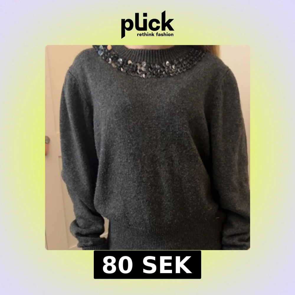 Snygg mörkgrå tröja med glittriga paljetter runt halsringningen. Tröjan har långa ärmar och ribbade muddar vid ärmslut och nederkant. Perfekt för att ge lite extra stil till din outfit.