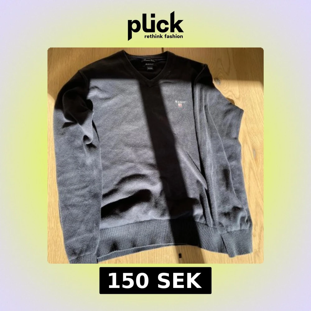 Säljer en mörkblå v-ringad tröja från GANT i mjuk bomull. Tröjan har långa ärmar, ribbade muddar och en liten broderad logga på bröstet. Perfekt för en stilren och klassisk look.