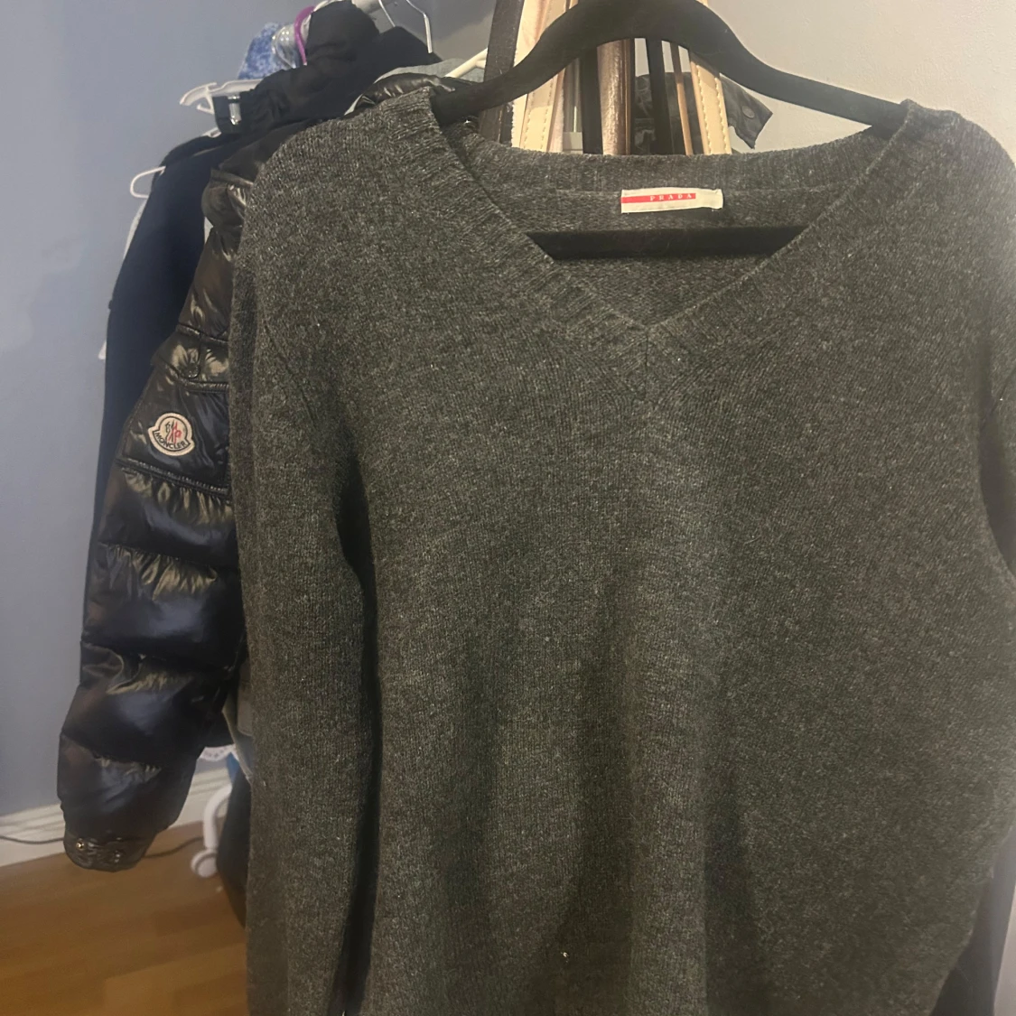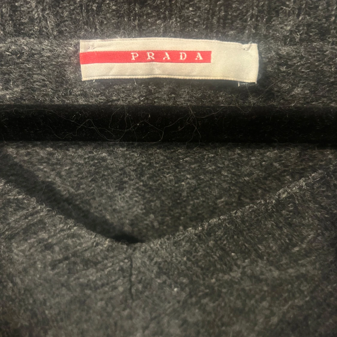 Mörkgrå v-ringad tröja från Prada i mjukt material. Klassisk och stilren design med långa ärmar och ribbade muddar. Perfekt för dig som gillar en enkel men lyxig look. Mycket bra skick