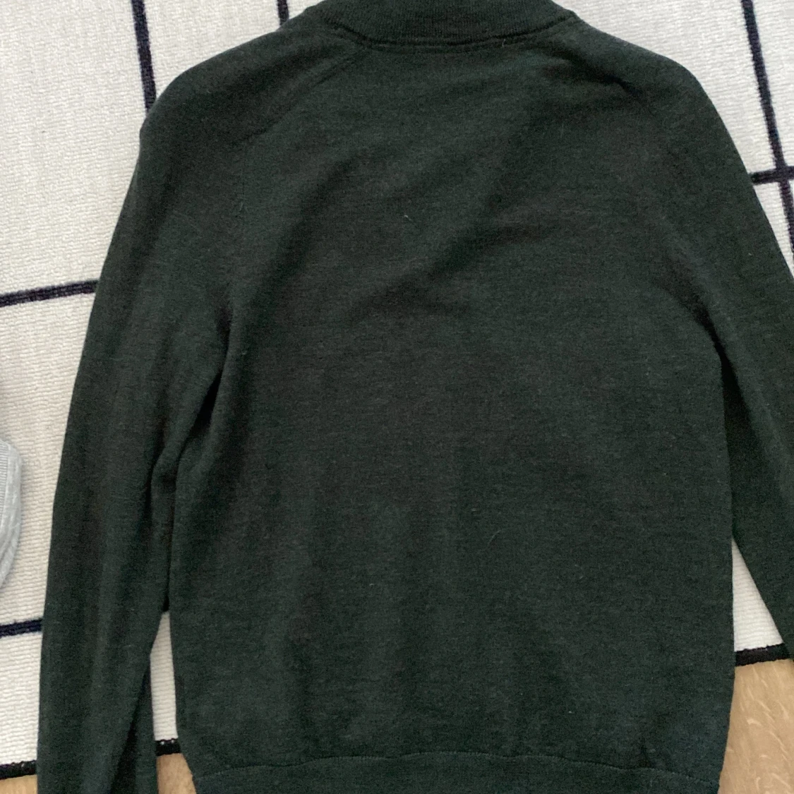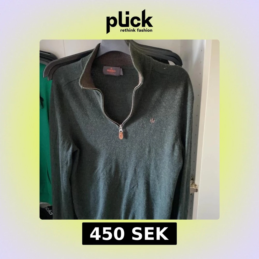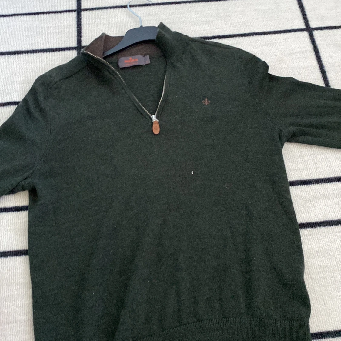 Säljer en mörkgrön stickad tröja från Morris med halv dragkedja och liten broderad logga på bröstet. Tröjan har lång ärm och ribbade muddar. Perfekt för lager-på-lager under kyliga dagar.