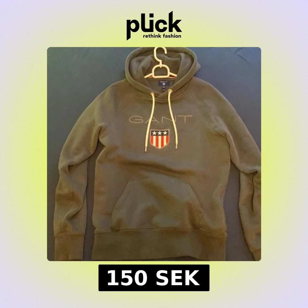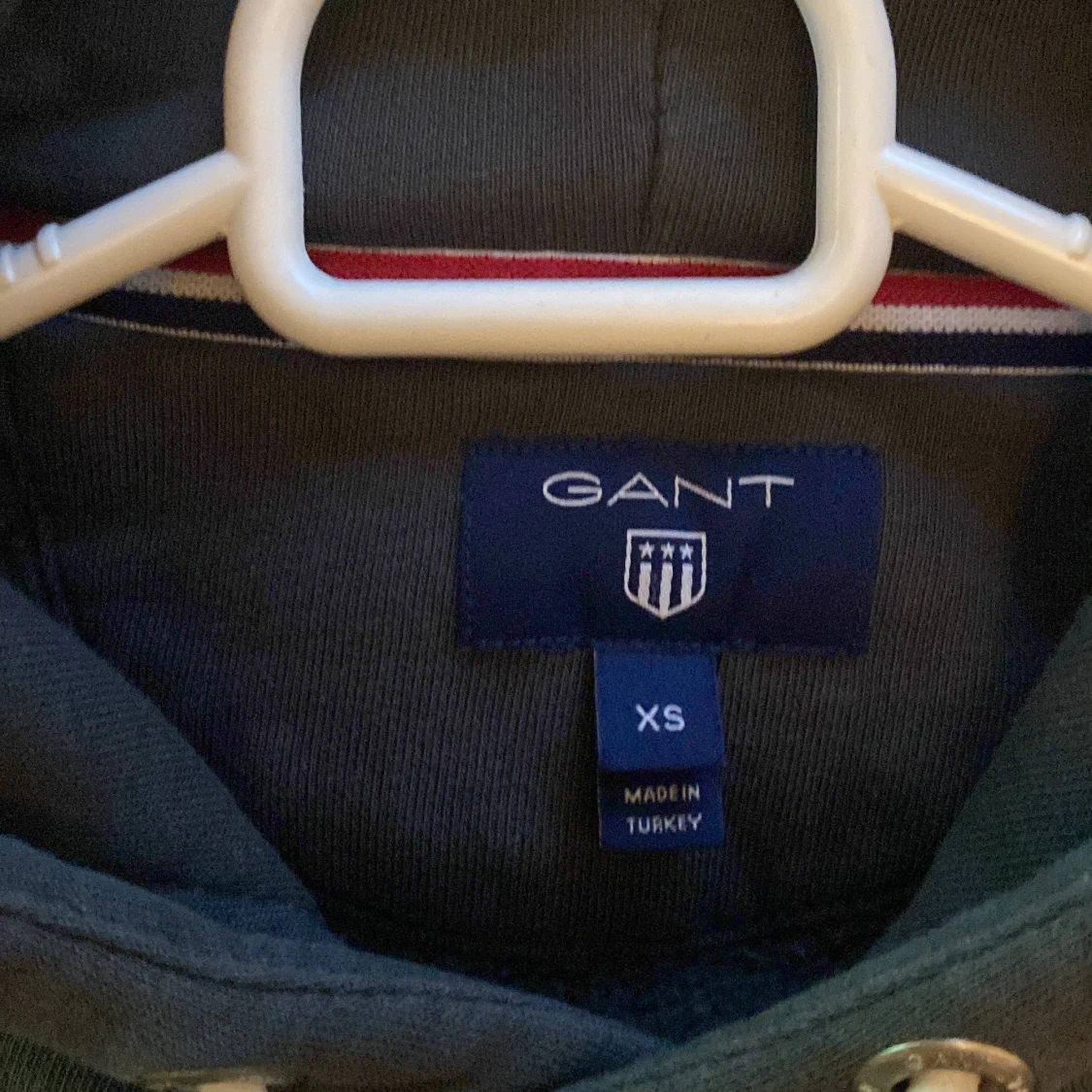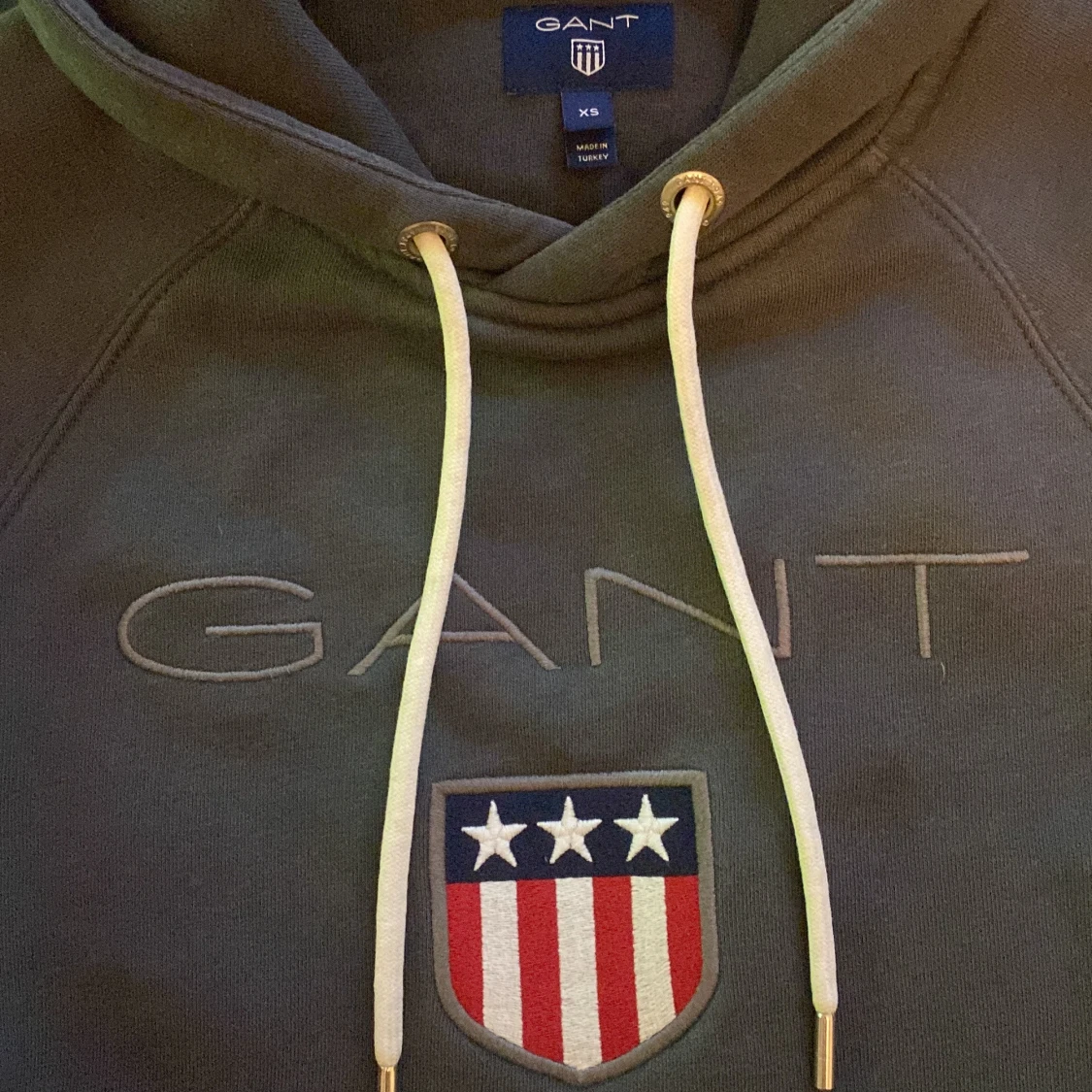 Säljer en mörkgrön hoodie från GANT i storlek XS. Tröjan har broderad GANT-logga och ett sköldmärke framtill, vita snören i huvan och klassisk känguruficka. Perfekt för dig som gillar stilren och sportig look.