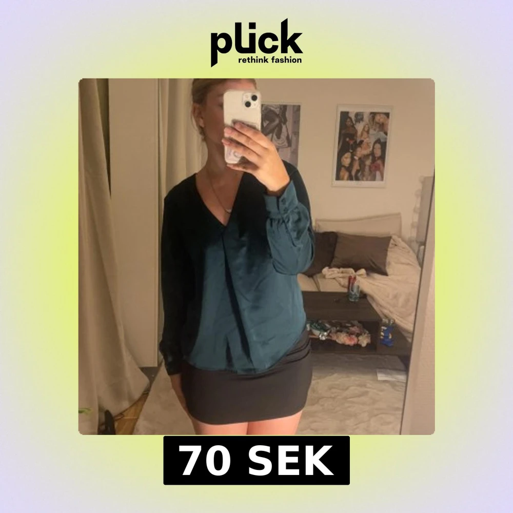 Snygg mörkgrön omlottblus med v-ringning och långa ärmar. Blusen har en lätt glansig finish och knappar vid ärmsluten, vilket ger en elegant touch. Perfekt att styla med kjol eller jeans för en trendig look.
