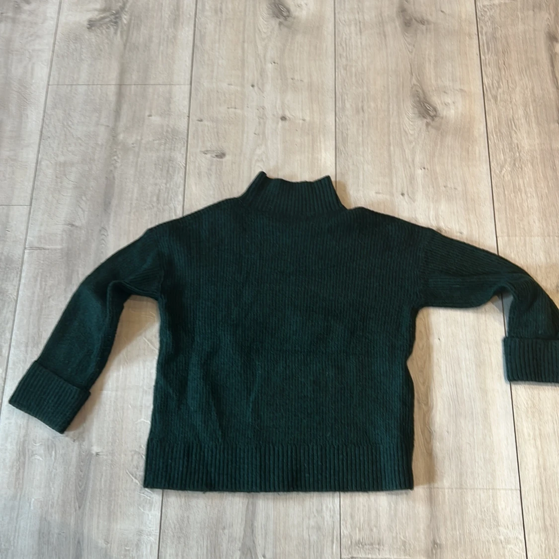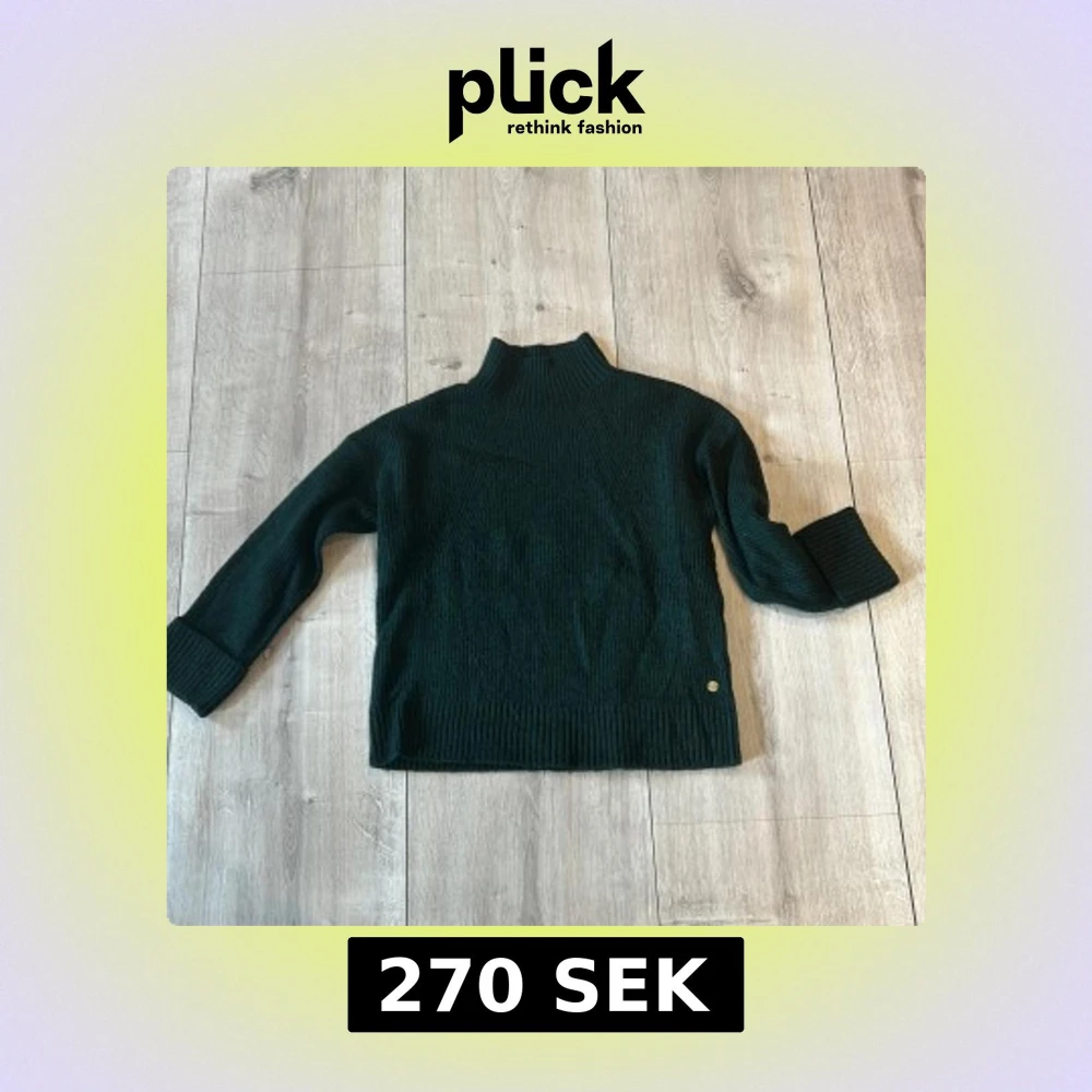 Mysig mörkgrön stickad polotröja med ribbade muddar och hög krage. Perfekt för kyliga dagar och enkel att matcha med olika outfits. Klassisk och stilren design utan synliga detaljer framtill.