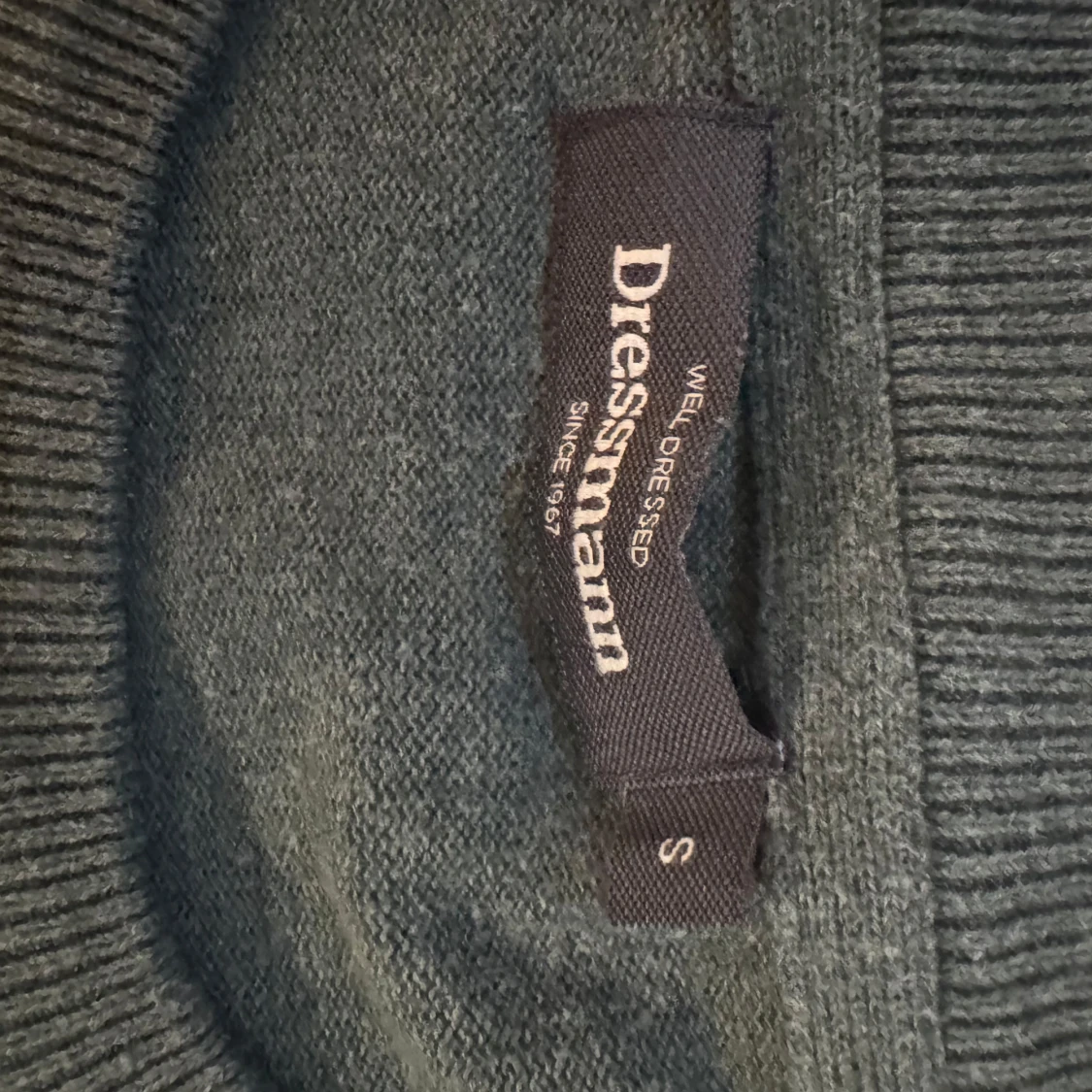 Snygg mörkgrön stickad tröja från Dressmann i storlek S. Tröjan har rund hals och långa ärmar med ribbade muddar vid hals, ärmslut och nederkant. Perfekt för dig som gillar enkel och stilren design.