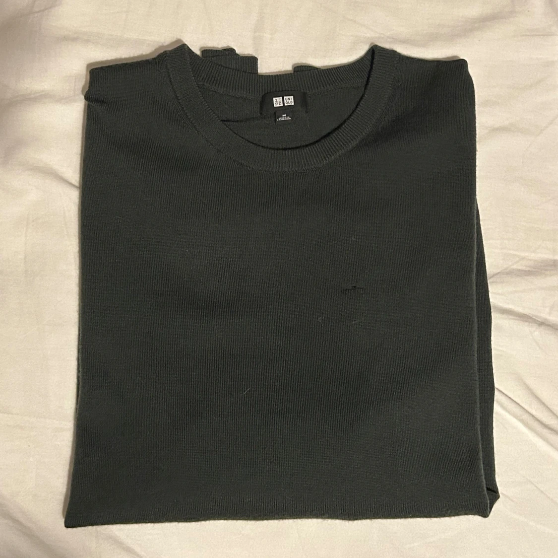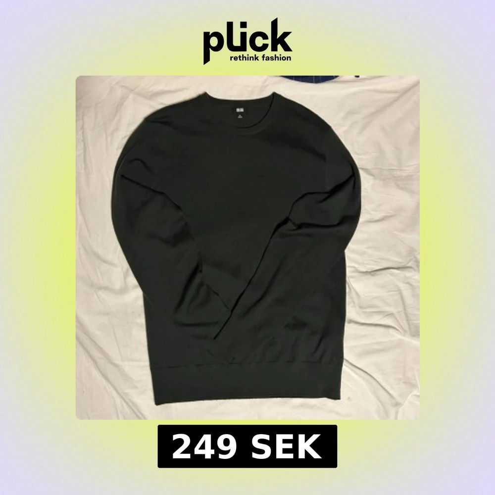 Säljer en stilren mörkgrön tröja från Uniqlo. Tröjan har en klassisk rund hals och är tillverkad i ett mjukt material som passar perfekt för kyligare dagar. Den har en liten defekt vid bröstet men som typ inte syns