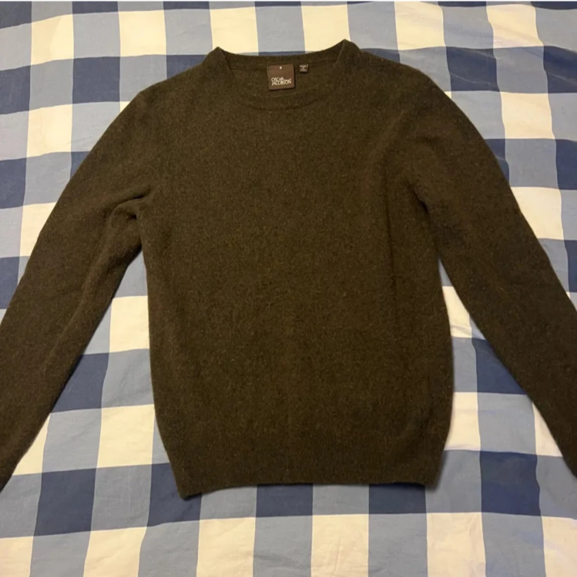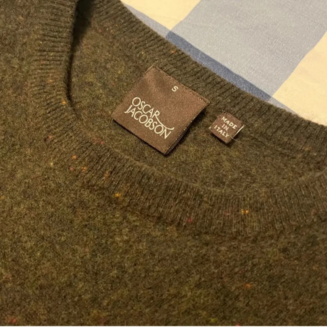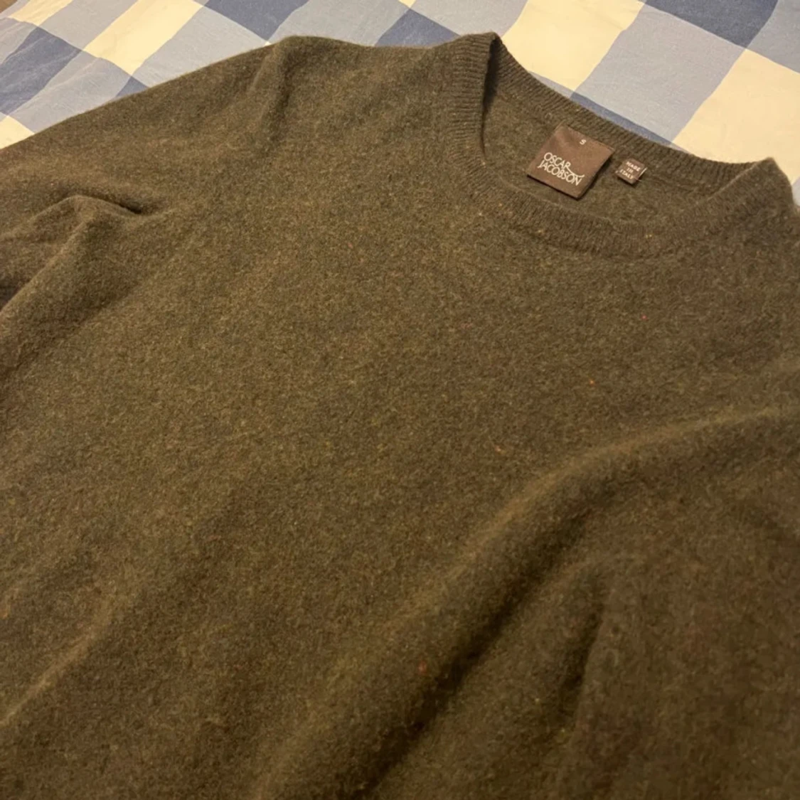 Säljer en stilren mörkgrön tröja från Oscar Jacobson, tillverkad i Italien. Tröjan är i ull och har en klassisk rund halsringning med långa ärmar. Perfekt för kyligare dagar.passar bra runt 160cm till 165cm
