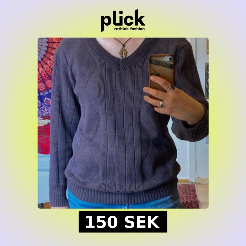Mysig mörklila stickad tröja med v-ringning med mönster i strukturen. Tröjan har långa ärmar och ribbade muddar vid ärmslut och nederkant. Väldigt mjukt material, känns skön mot huden. Inga defekter