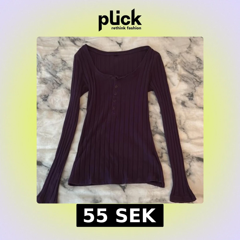 Säljer en mörklila långärmad topp med ribbad struktur och knappar framtill. Jag kommer inte ihåg vart jag köpt tröjan ifrån eftersom jag har klippt bort prislappen när jag köpte den:)