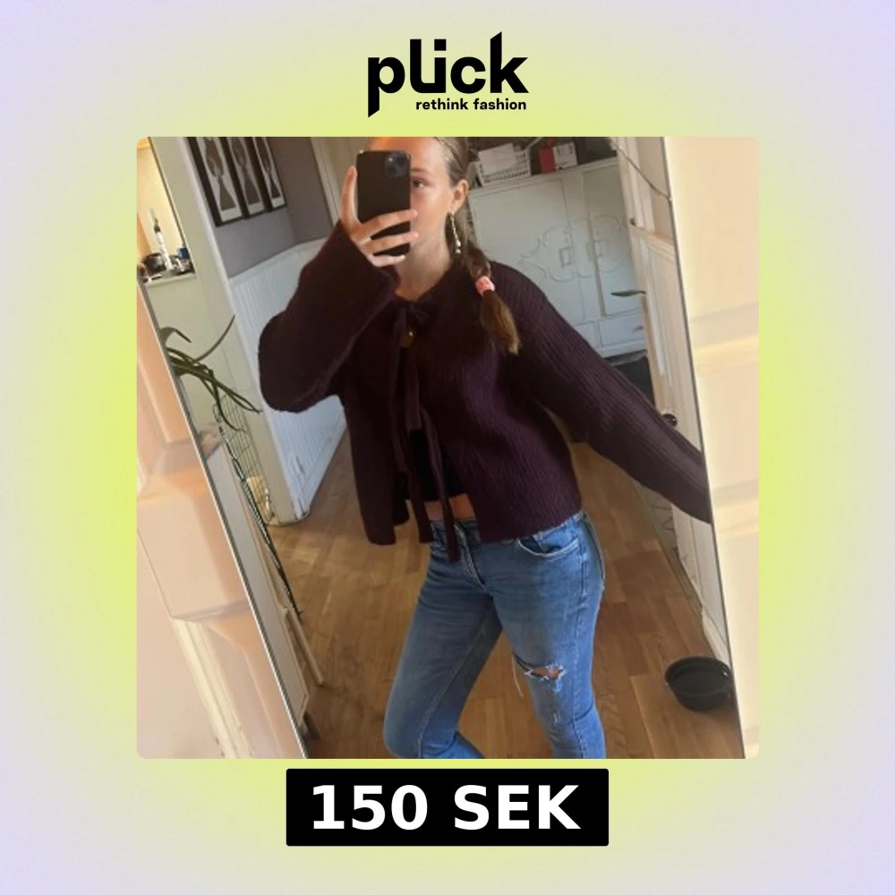 Säljer en mysig mörklila stickad kofta med två stora knytband framtill. Koftan har lång ärm och en loose passform, perfekt att slänga över en topp. Den är fluffig och har en enkel, stilren look.