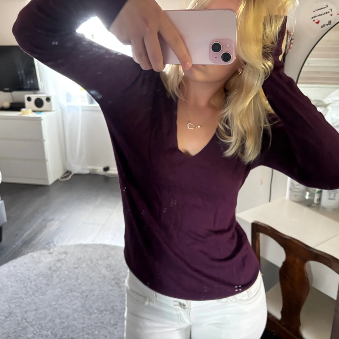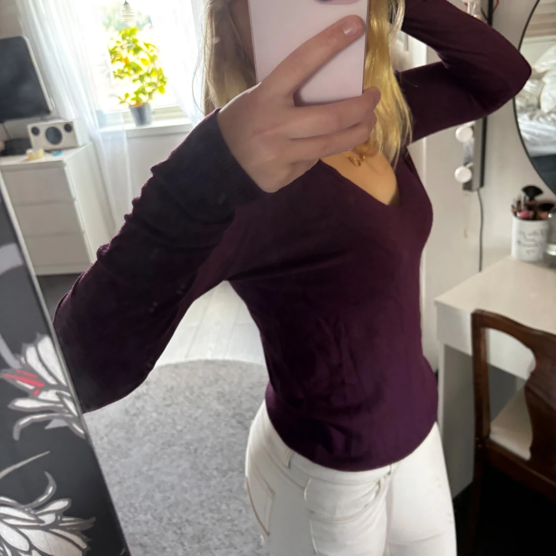 Säljer en mörklila stickad tröja med v-ringning och långa ärmar. Tröjan har en slim passform och är perfekt för dig som gillar en enkel men snygg stil. Materialet är mjukt och skönt mot huden.