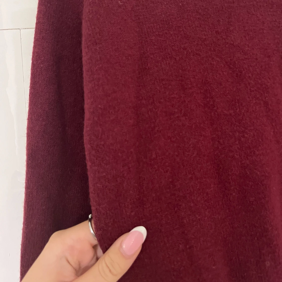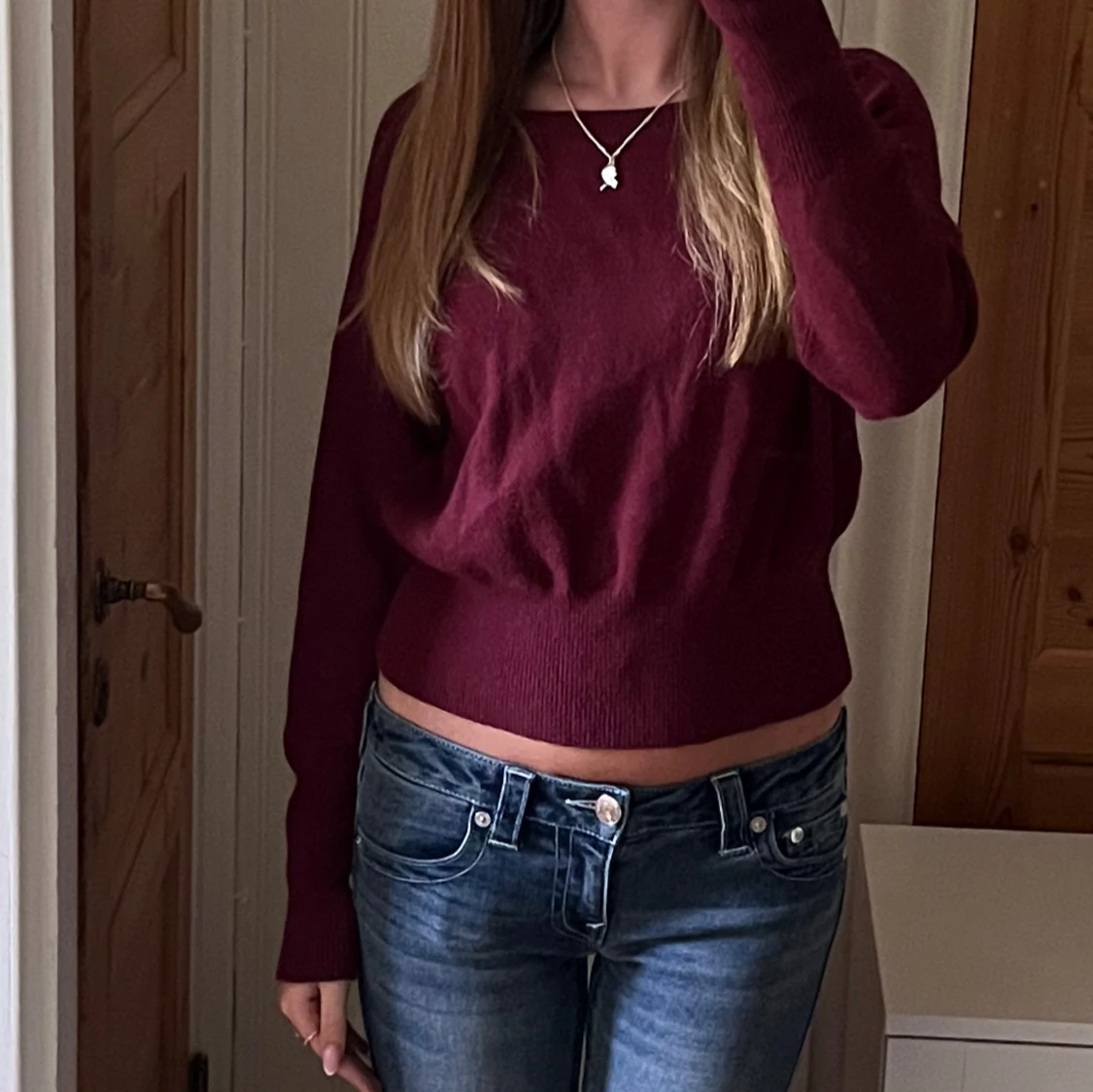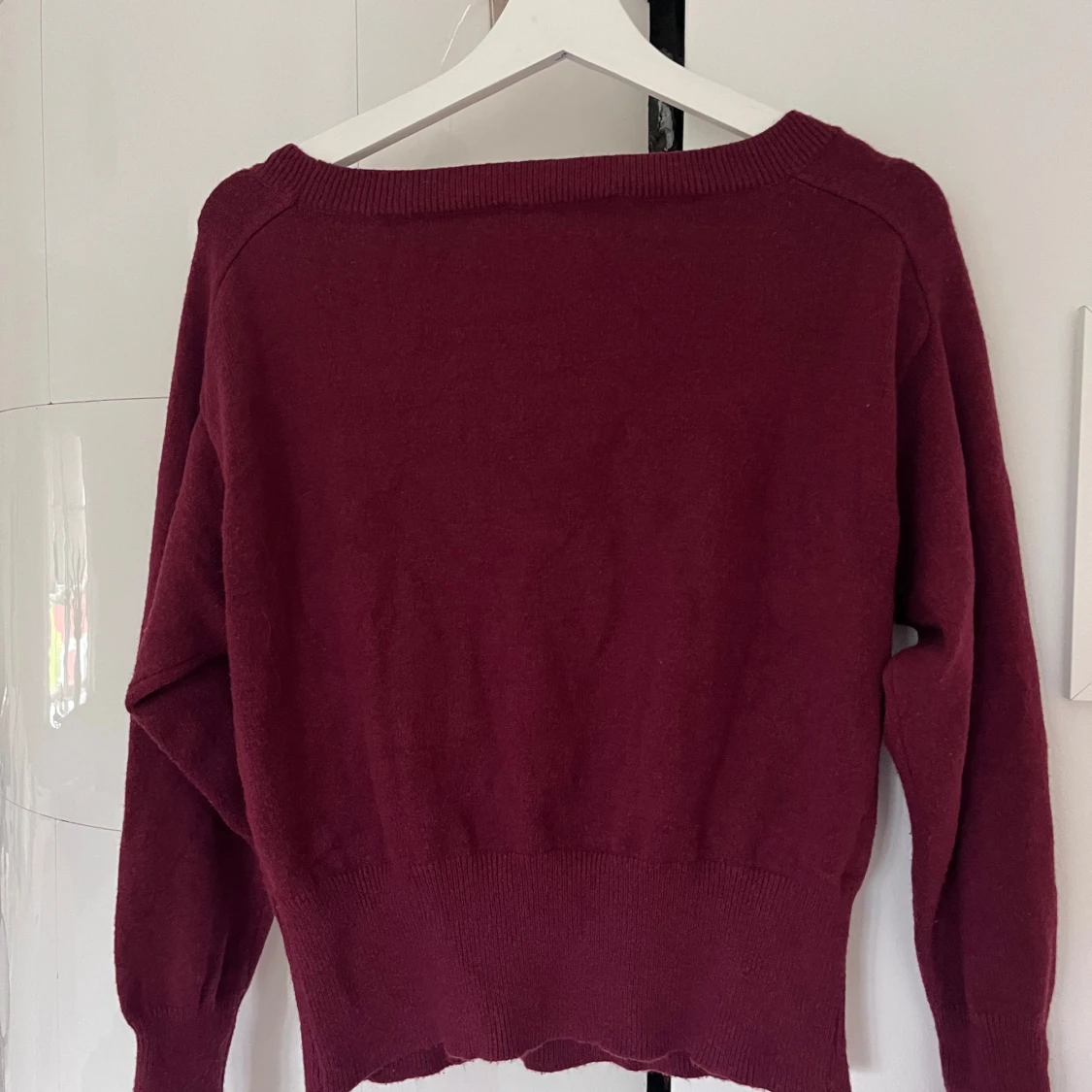 Mysig mörkröd stickad tröja med bred, ribbad halsringning och långa ärmar från bikbok, perfekt till hösten!💕OBS har lite små noppror över hela tröjan men inget man lägger märkte till så mycket