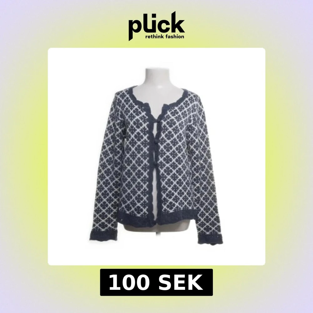 Säljer en blå och vit kofta från Rose Bud i storlek M. Koftan har ett klassiskt mönster, långa ärmar och dekorativa kanter. Den knyts baktill med ett band