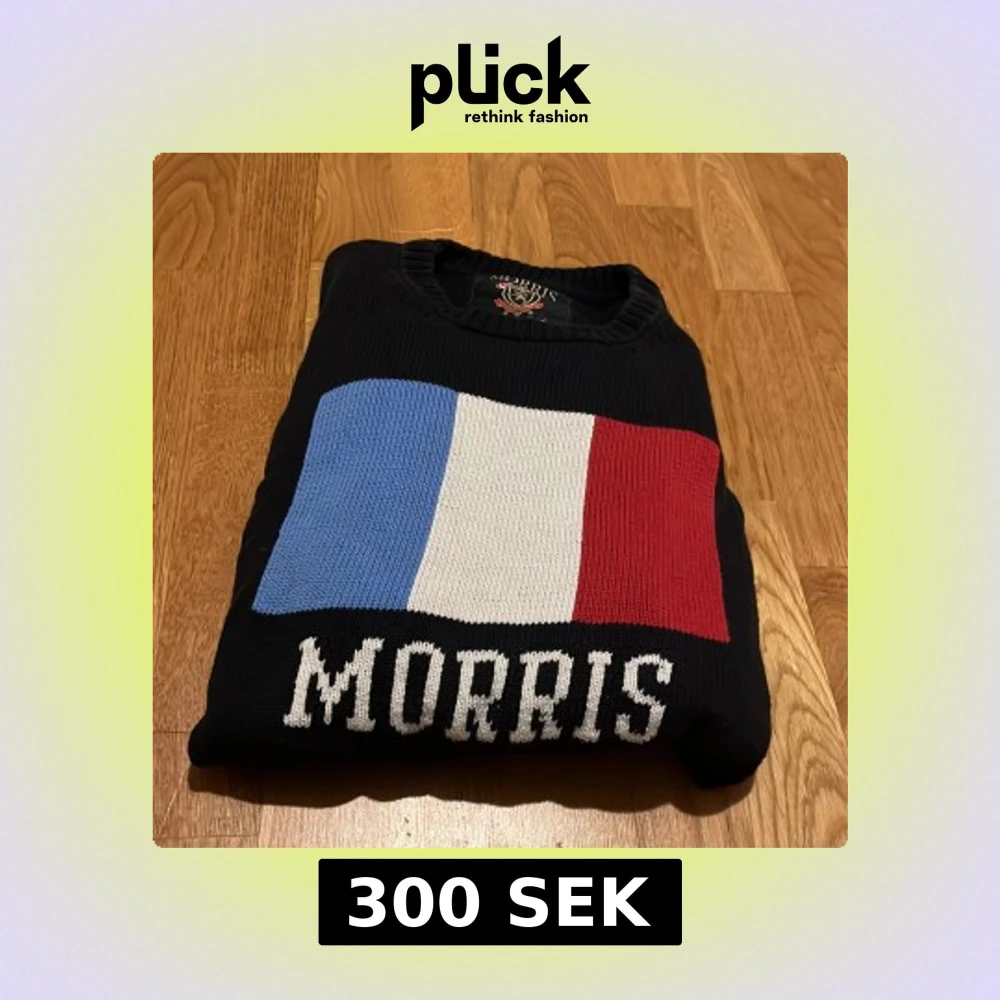 Svart stickad tröja från Morris i storlek Large med fransk flagga i blått, vitt och rött på bröstet samt Morris-logga under. Rund hals och ribbade muddar vid ärmslut och nederkant. Snygg detalj med ett litet M i guld på ena ärmen. Storleken passar både M och L, skicket är mycket fint! Hör av dig om du har några frågor