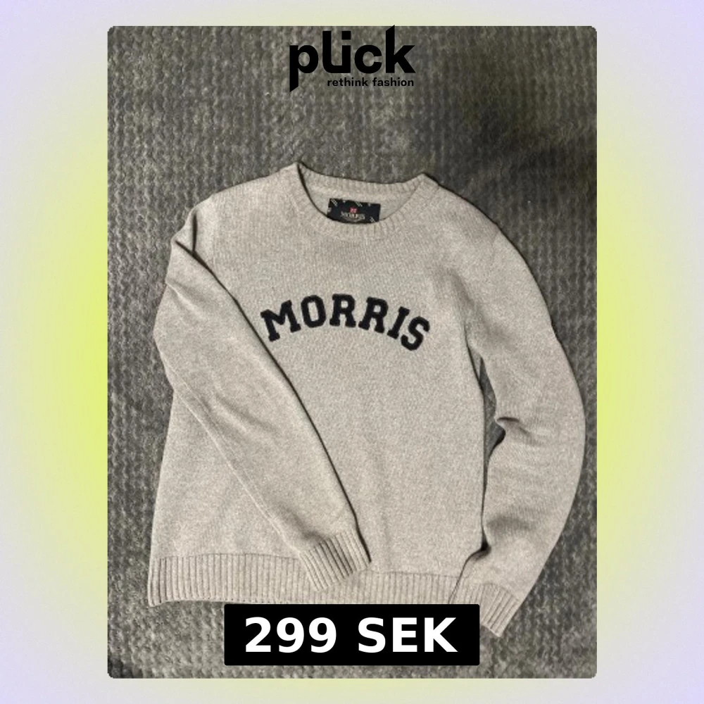 Snygg grå stickad tröja från Morris med svart broderad logga på bröstet och en liten brittisk flagga på ärmen. Rund hals och ribbade muddar vid ärmslut och nederkant. Perfekt för dig som gillar klassisk stil med en modern touch.