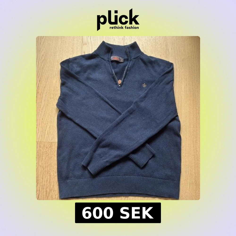 Säljer en mörkblå stickad tröja från Morris med halv dragkedja och hög krage. Tröjan har ribbade muddar och en liten broderad logga på bröstet. Perfekt för kyligare dagar och enkel att matcha.