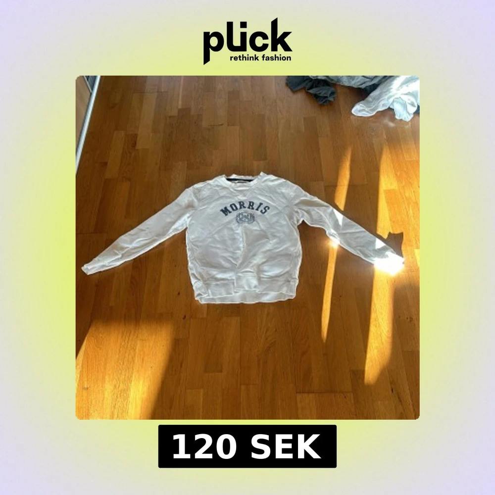 Säljer en vit sweatshirt från Morris med blå text och emblem på bröstet. Tröjan har rund halsringning och långa ärmar. Perfekt för en avslappnad och stilren look.