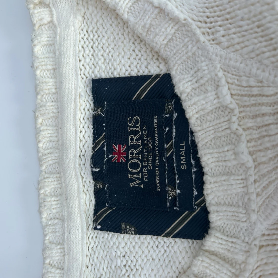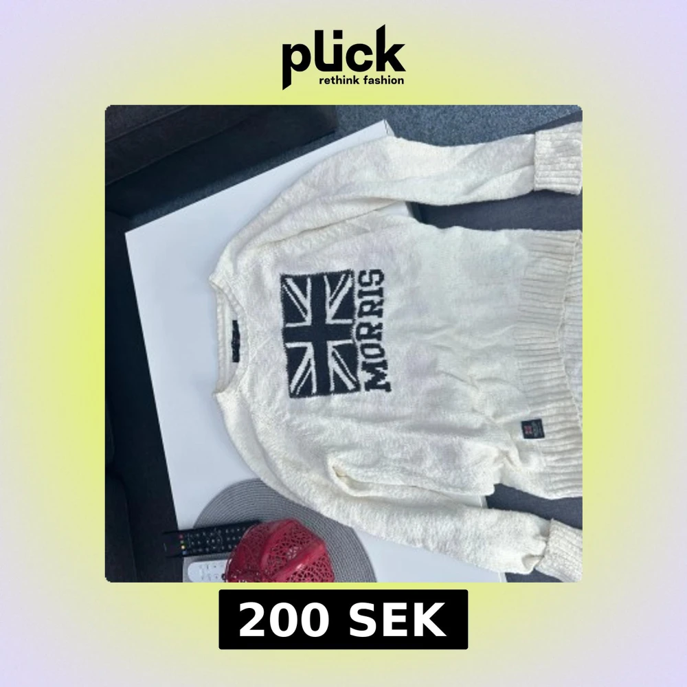 Säljer en stilren vit stickad tröja från Morris med ett stort svart Union Jack-motiv och texten 'Morris' på framsidan. Tröjan har långa ärmar och ribbade kanter vid ärmslut och nederkant. Perfekt för en avslappnad och trendig look. Bra skick men tecken på användning, skriv för mer info!