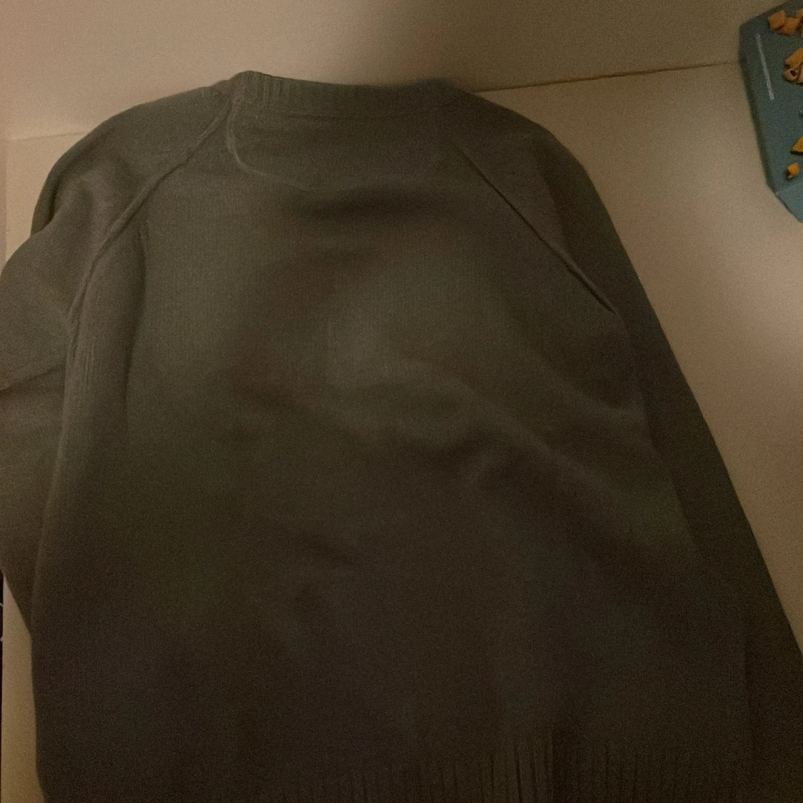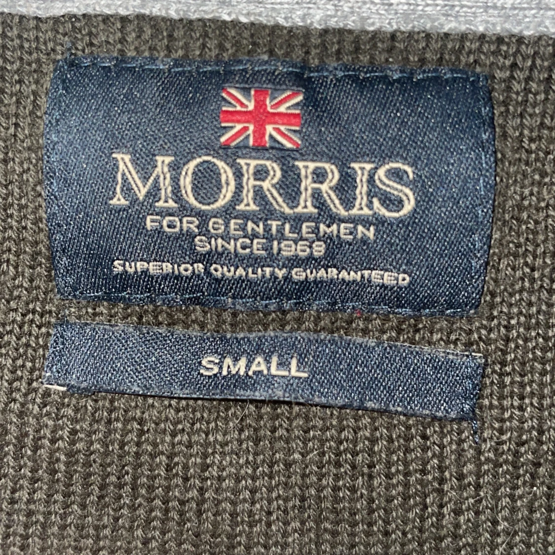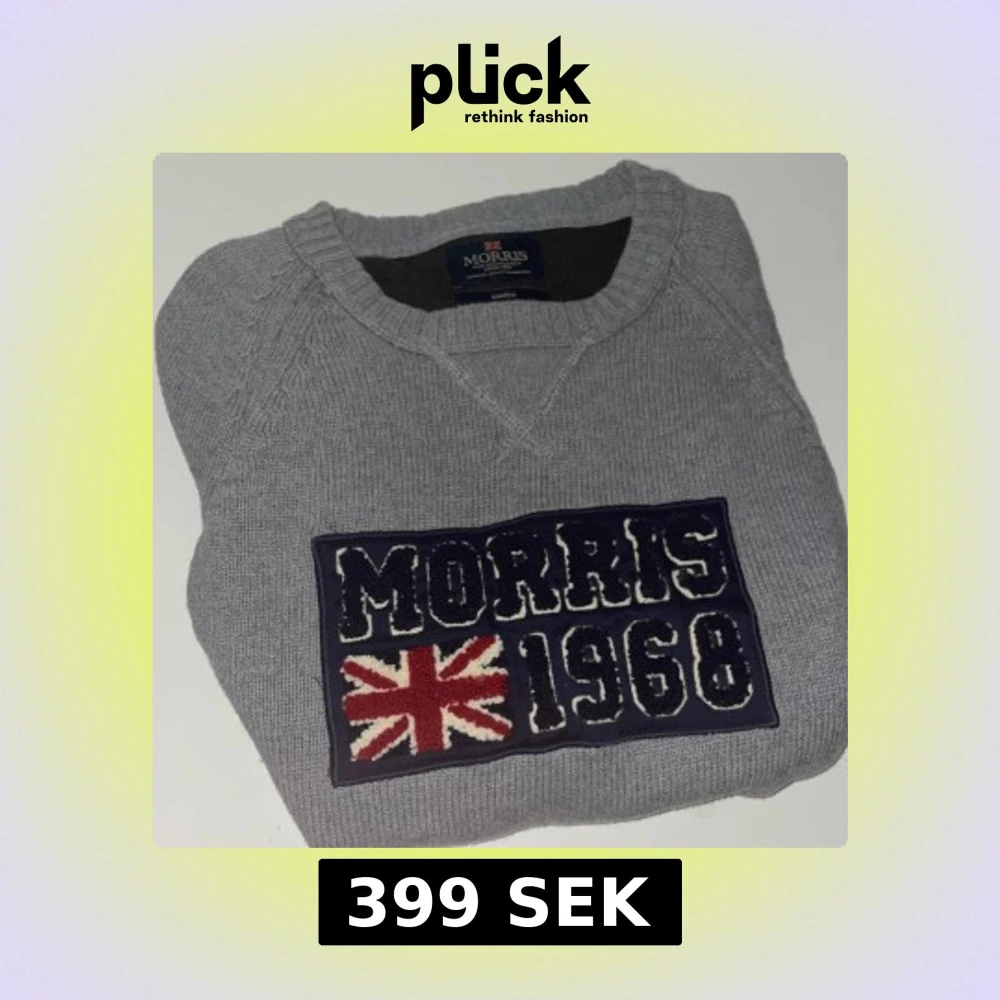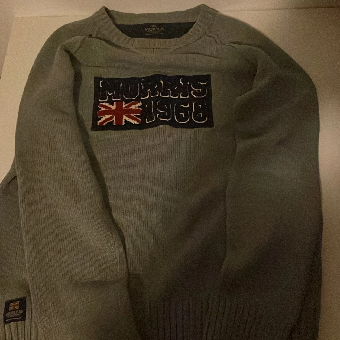 Säljer en stilren grå tröja från Morris med ett broderat märke på bröstet som visar 'Morris 1968' och en brittisk flagga. Tröjan har en v-ringad hals och långa ärmar, perfekt för en avslappnad stil.