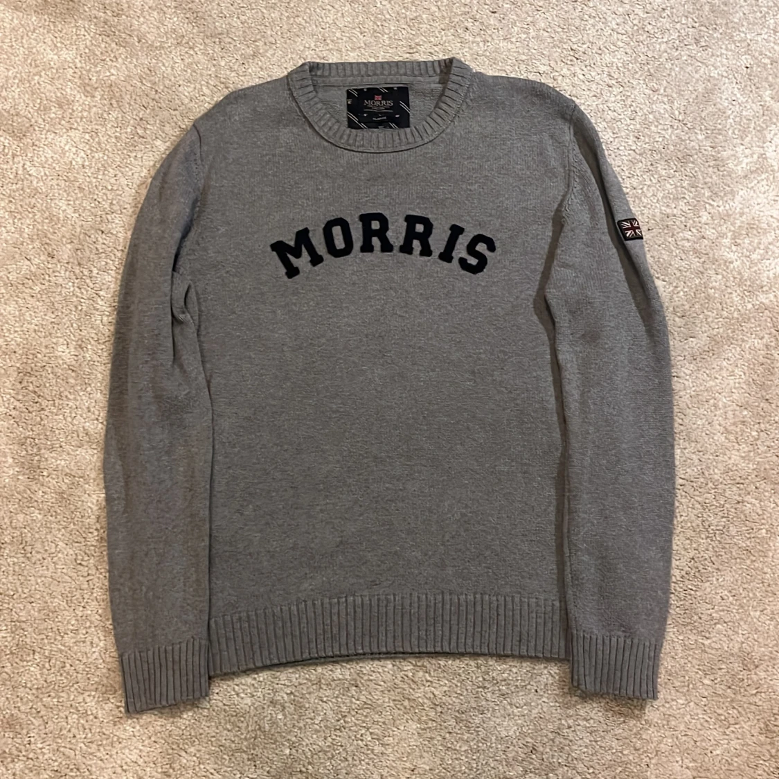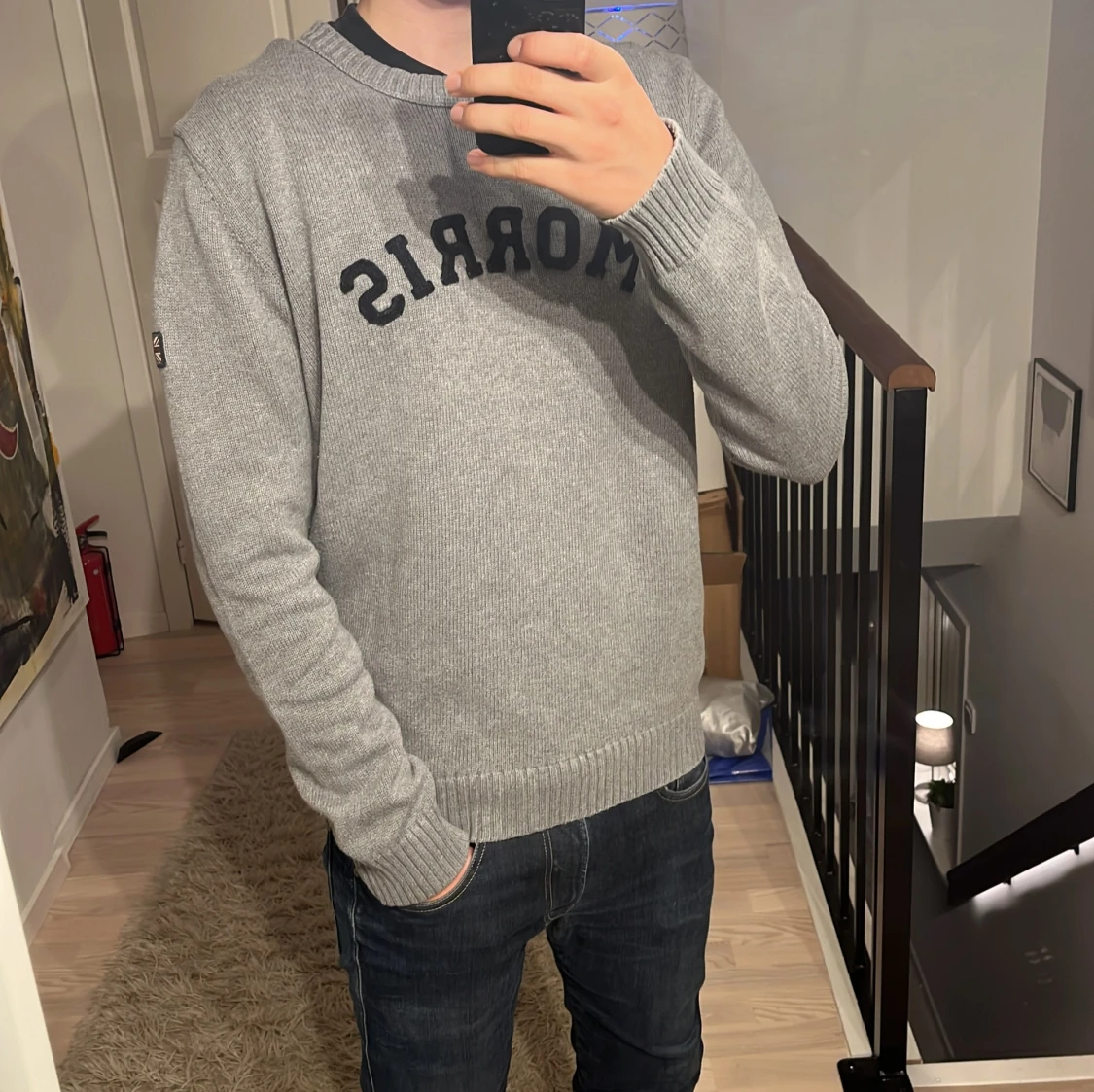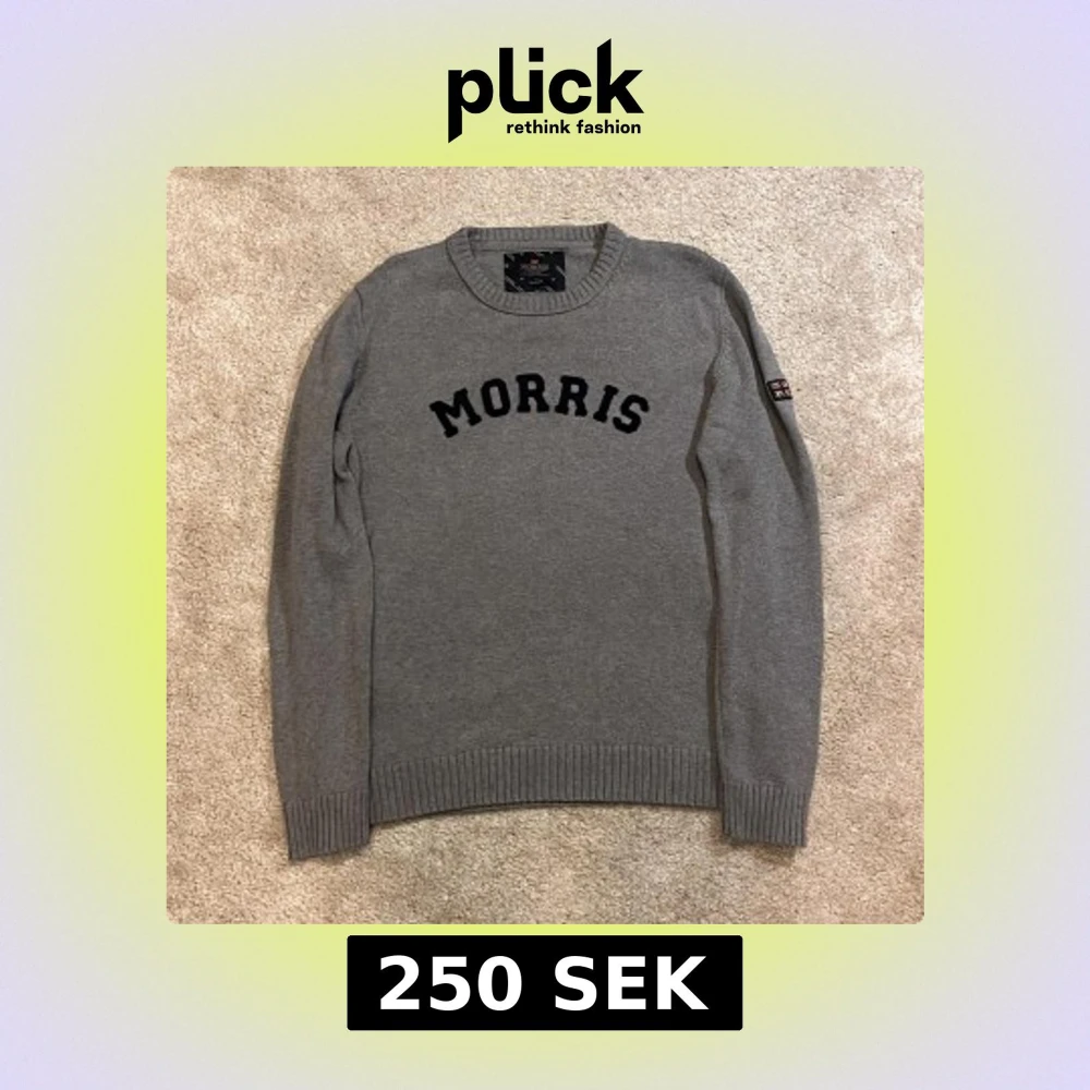 Hej! Säljer denna stickade Morris tröjan i en grå färg med mörkblå text frampå bröstet! Mycket fin och varm nu till höst/vintern 👍denna sitter bra på mig som är 180 och väger 67kg och bär vanligtvis storlek medium. Står att de är X-Large men jag upplever att den skulle sitta bäst på dig som bär storlek Large. Tröjan är i ett fint skick och är inte nopprig. Nytvättad och redo för nästa användare 😊100% bomull. Skriv vid frågor/ funderingar 🙌