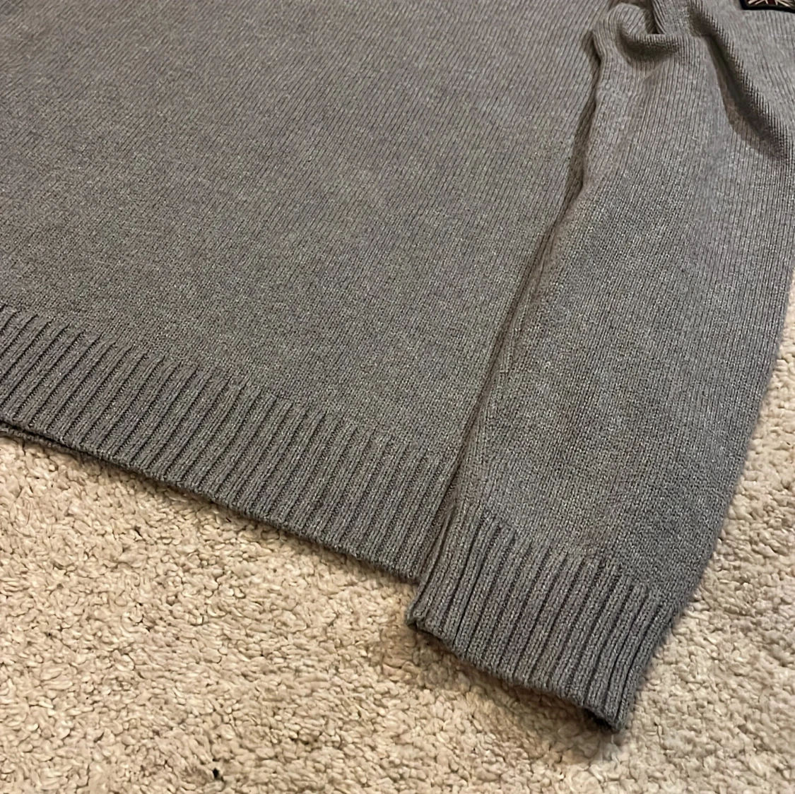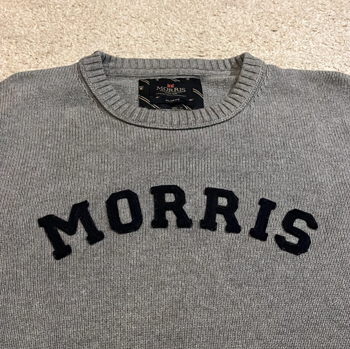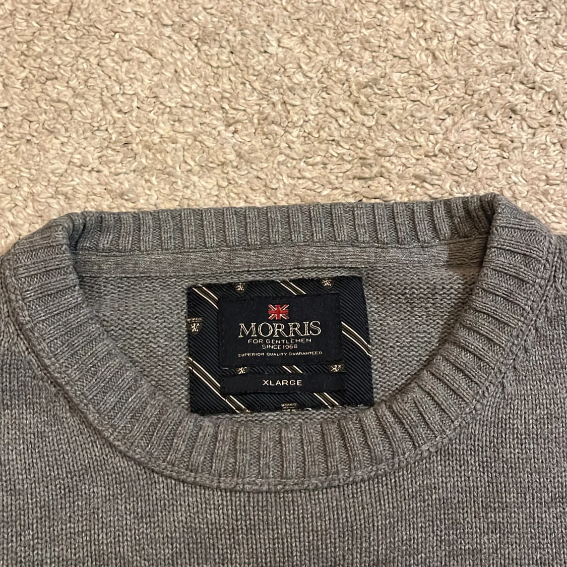 Hej! Säljer denna stickade Morris tröjan i en grå färg med mörkblå text frampå bröstet! Mycket fin och varm nu till höst/vintern 👍denna sitter bra på mig som är 180 och väger 67kg och bär vanligtvis storlek medium. Står att de är X-Large men jag upplever att den skulle sitta bäst på dig som bär storlek Large. Tröjan är i ett fint skick och är inte nopprig. Nytvättad och redo för nästa användare 😊100% bomull. Skriv vid frågor/ funderingar 🙌