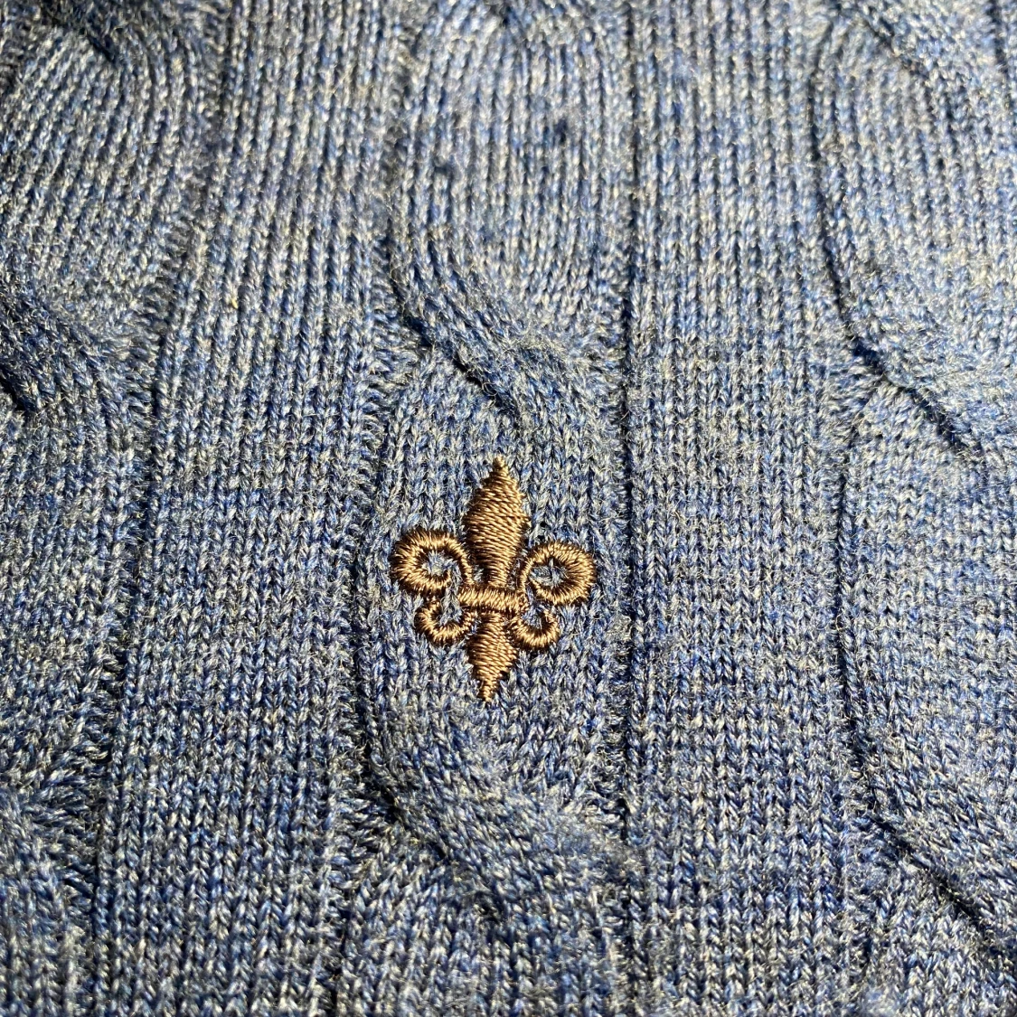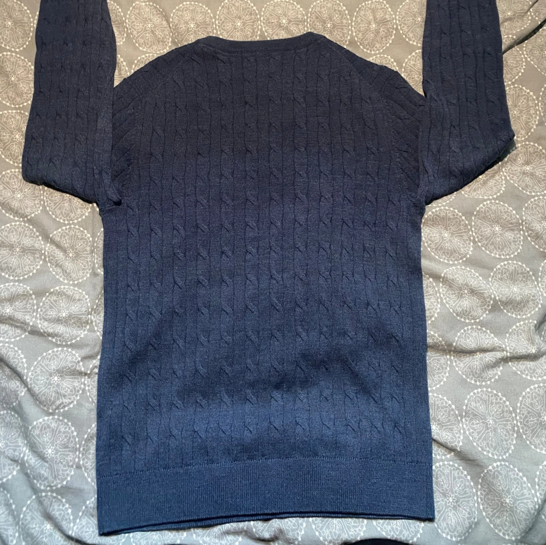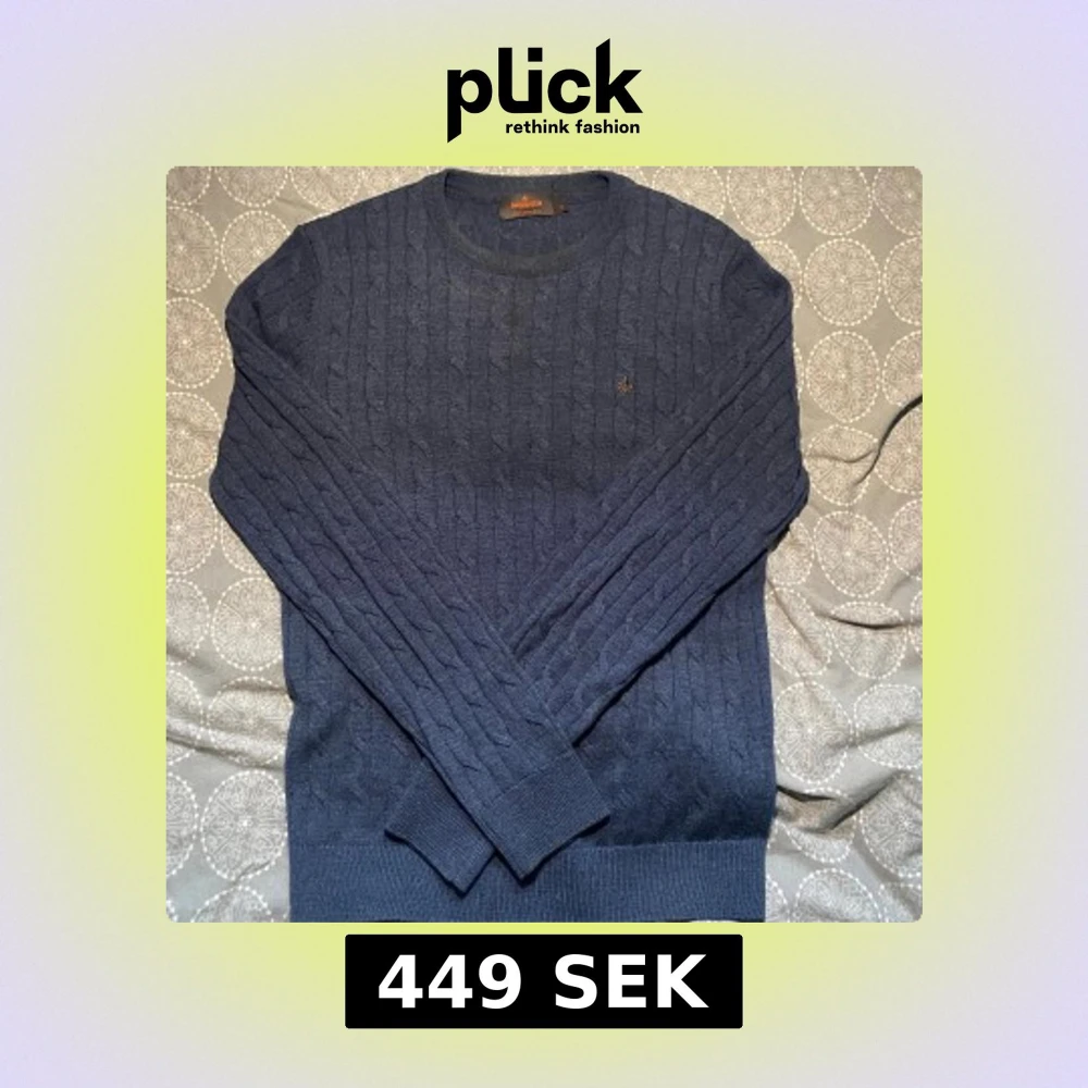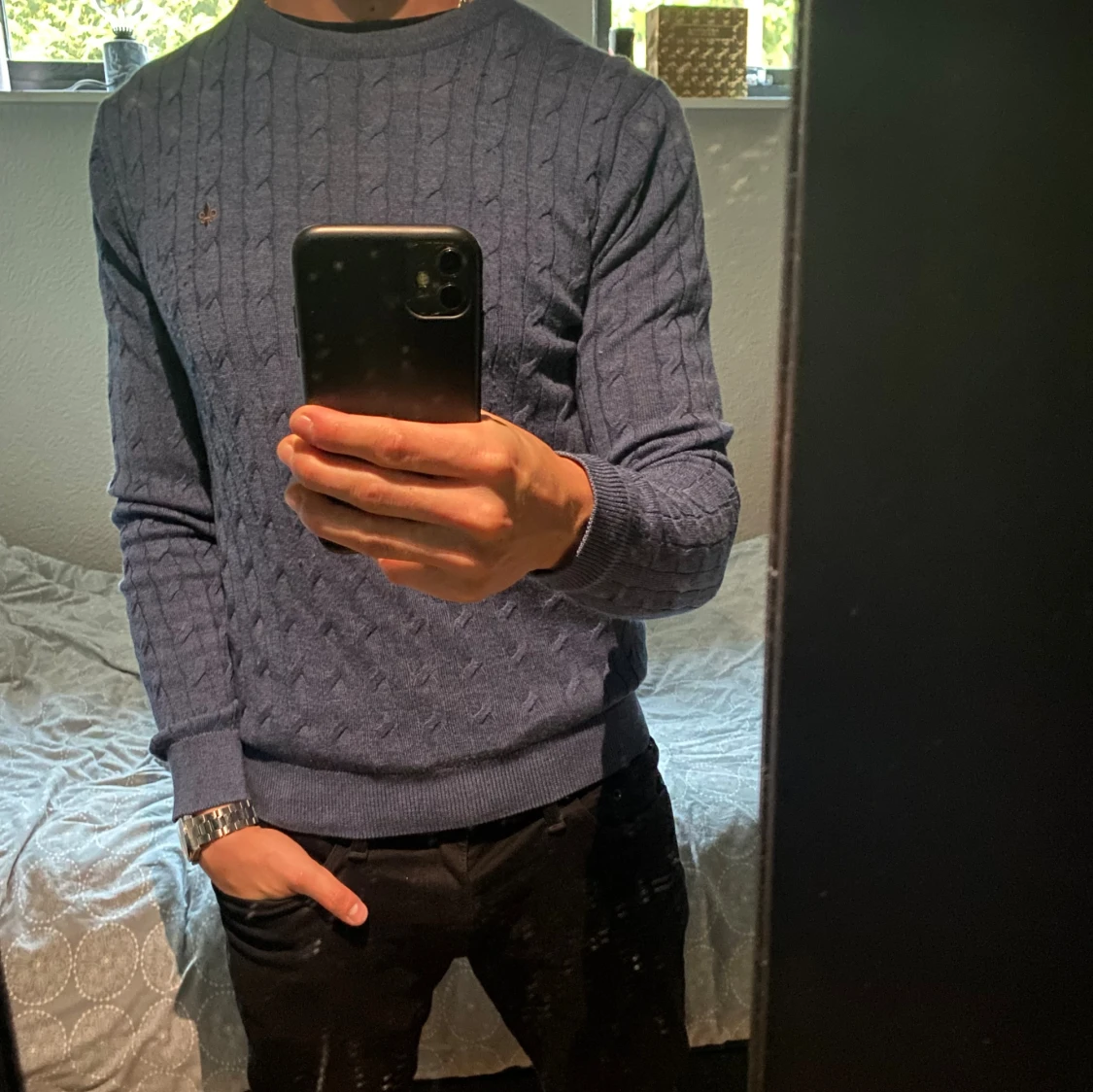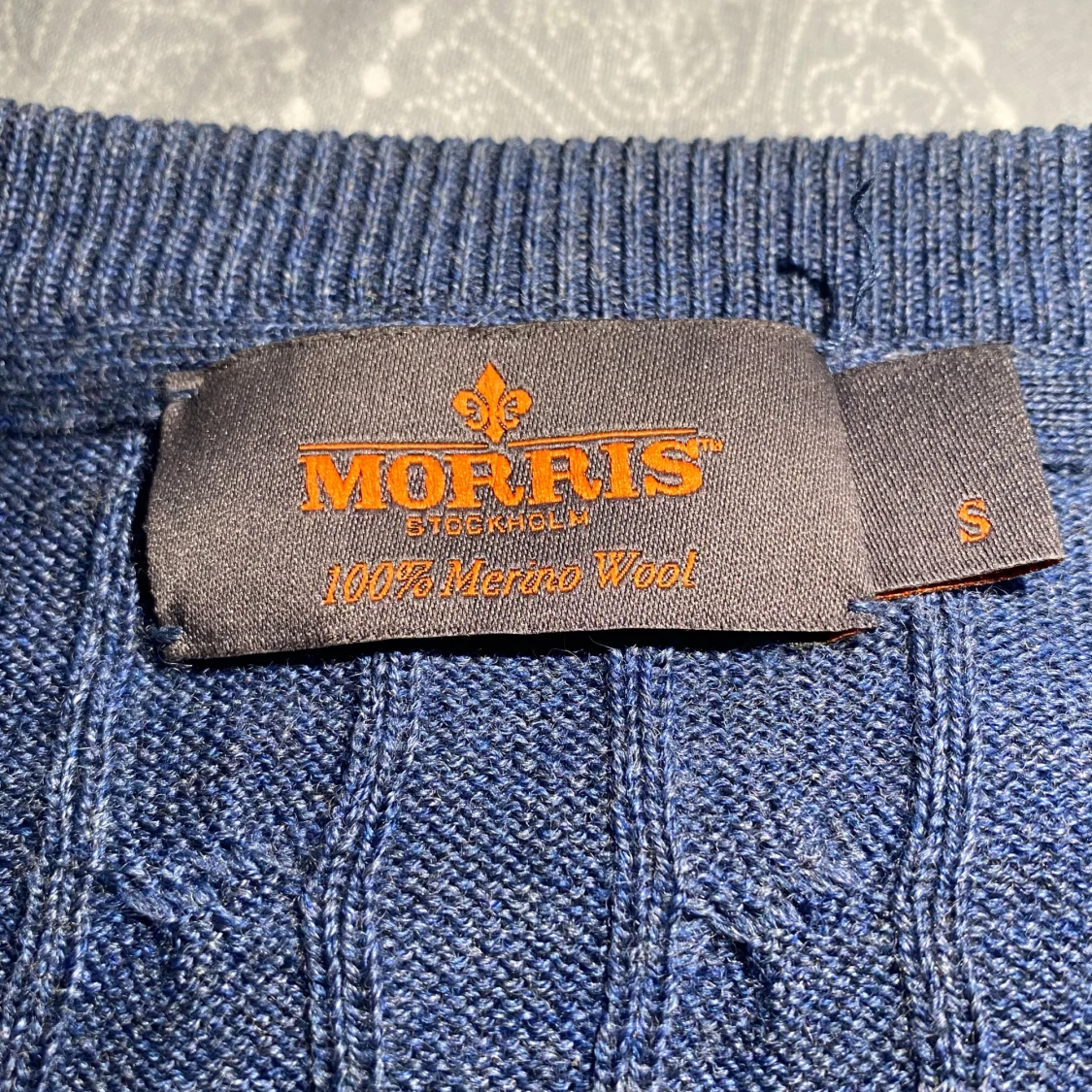 Kabelstickad blå tröja från Morris i 100% merinoull i storlek S. Varsamt använd och därmed i ett väldigt bra skick. Nypris: 1699kr. Mitt pris: 499kr