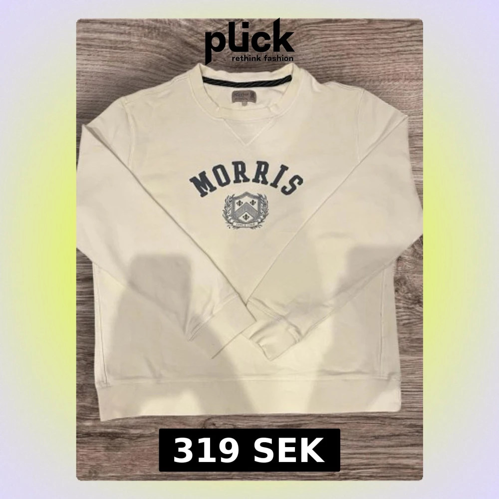 Säljer en stilren vit sweatshirt från Morris i storlek L. Tröjan har tryckt logga och emblem på bröstet, rund hals och ribbade muddar vid ärmslut och nederkant. Perfekt för dig som gillar klassisk och enkel design.
