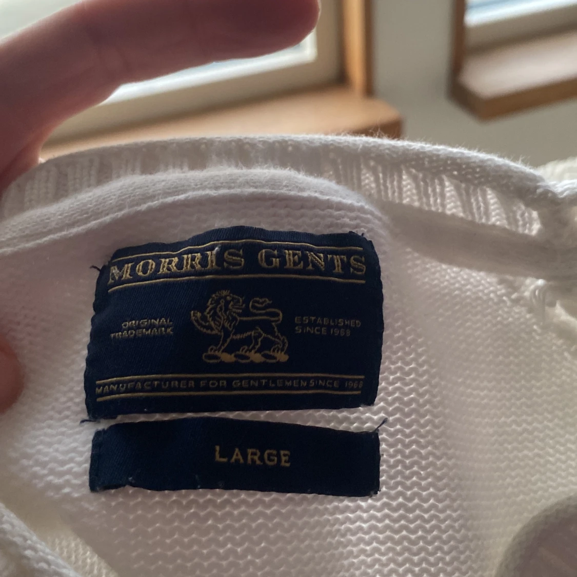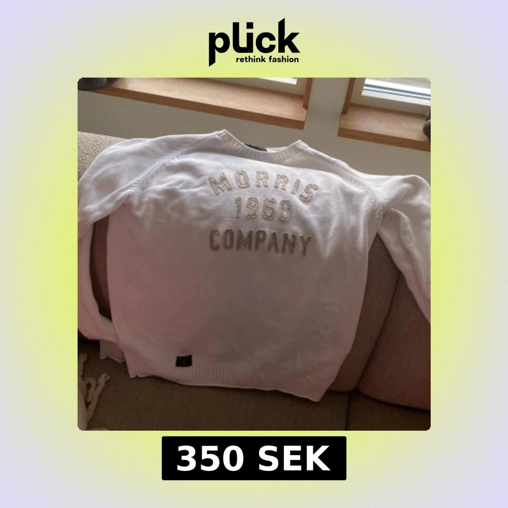 Säljer en stilren vit tröja från Morris med texten 'Morris 1968 Company' broderad på framsidan. Tröjan har långa ärmar och en klassisk rund halsringning. Perfekt för en avslappnad och snygg look.