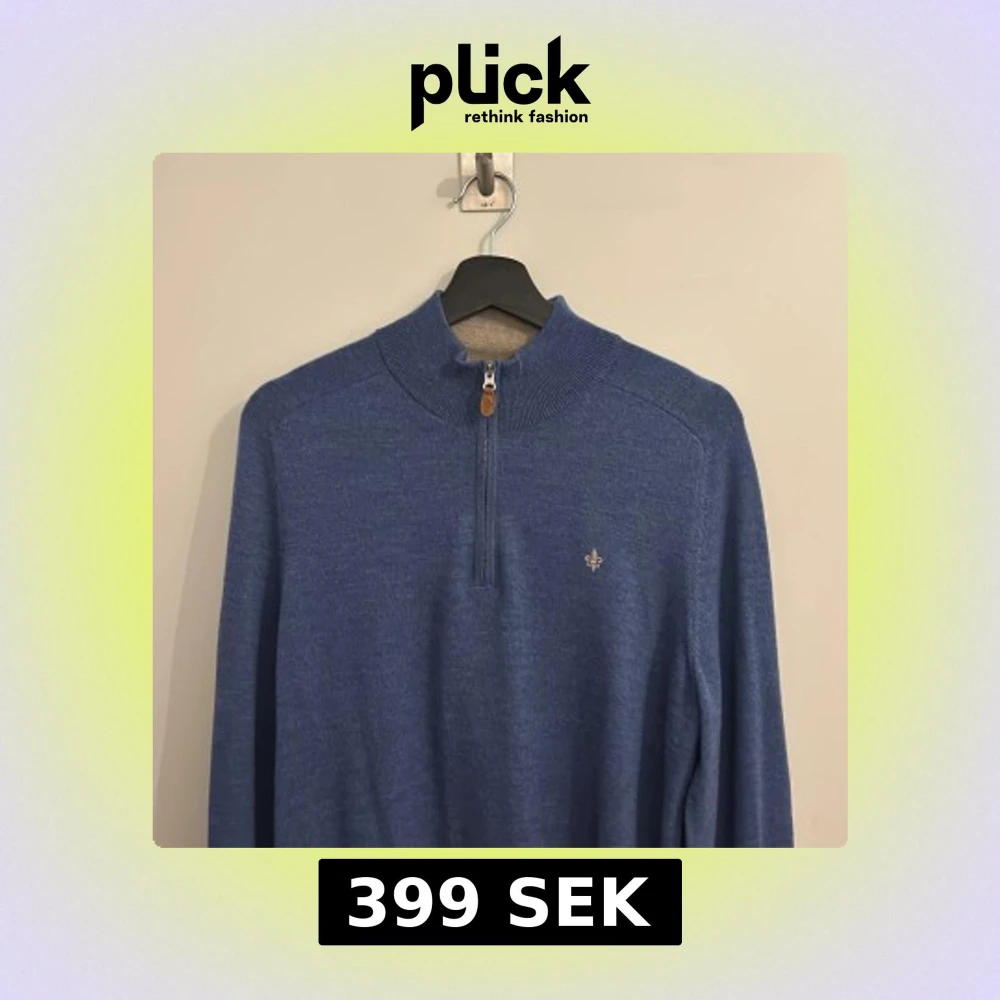 Snygg blå stickad tröja från Morris i 100% merinoull. Tröjan har half zip med läderdetalj, hög krage och diskret logga på bröstet. Perfekt för dig som gillar klassisk stil med modern touch.