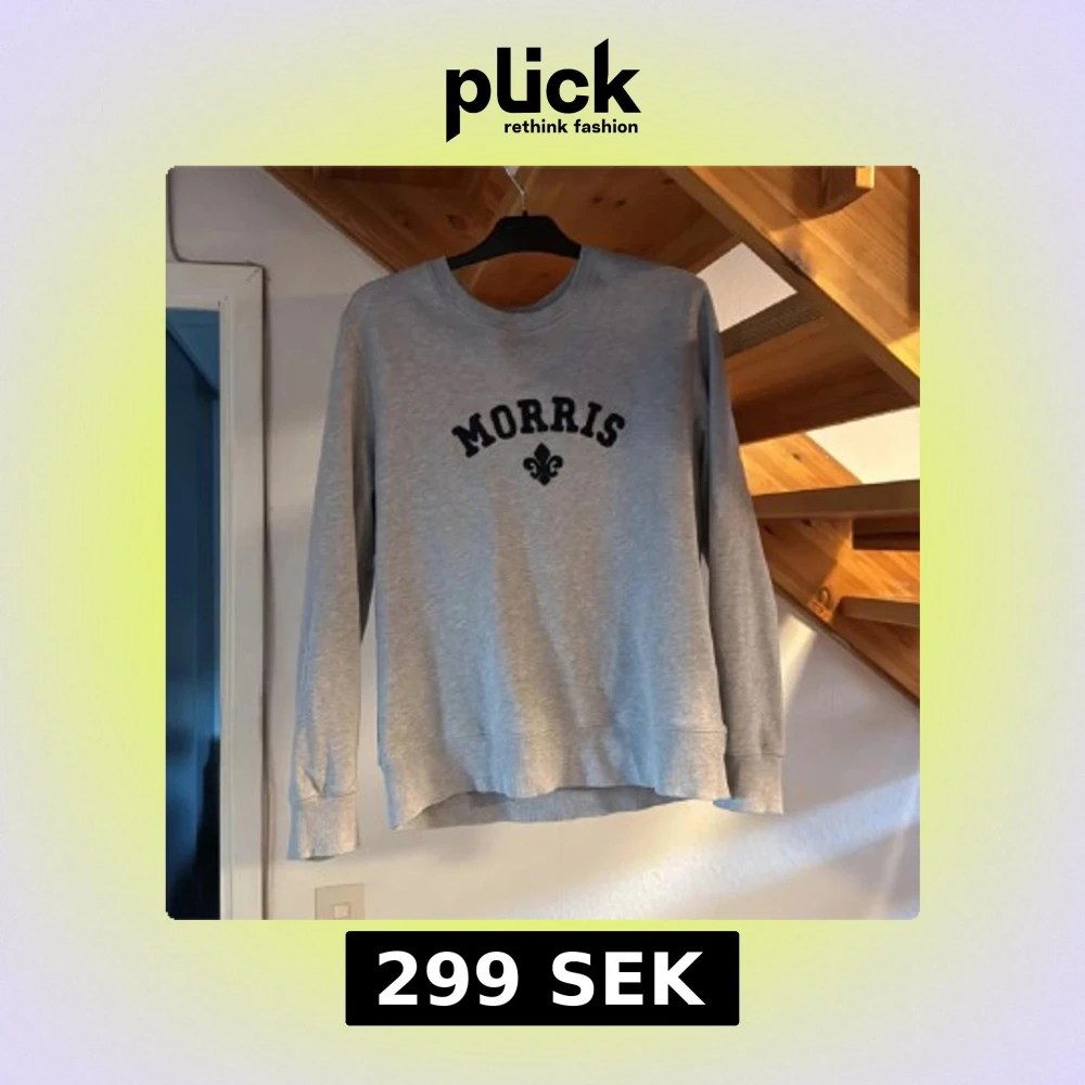 Säljer en stilren grå sweatshirt från Morris med svart tryck på bröstet. Tröjan har rund halsringning och långa ärmar, perfekt för en avslappnad och snygg look. Klassisk passform och mjukt material. Storleken är L.