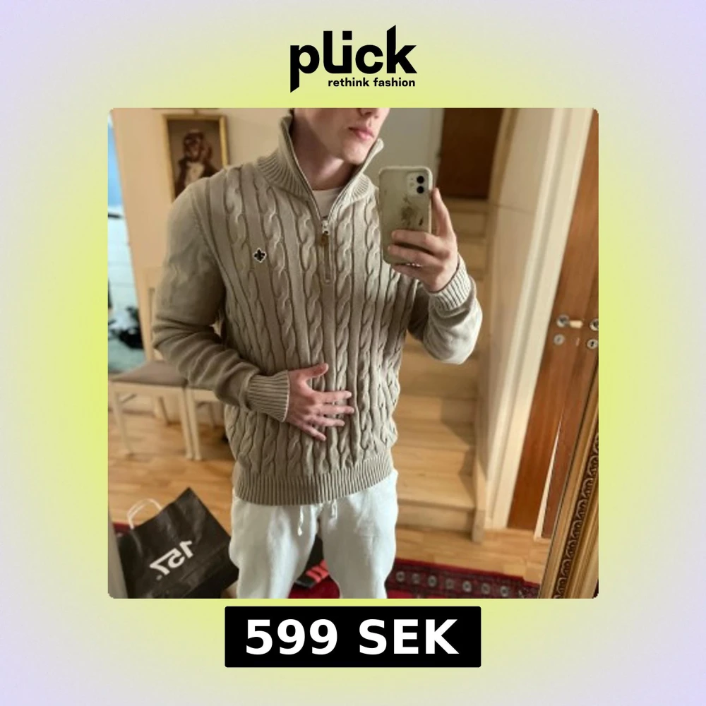 Säljer en beige stickad tröja från Morris med kabelstickat mönster och halv dragkedja framtill. Tröjan har hög krage och ribbade muddar. Perfekt för lager-på-lager och snygg detalj med Morris-loggan på bröstet.