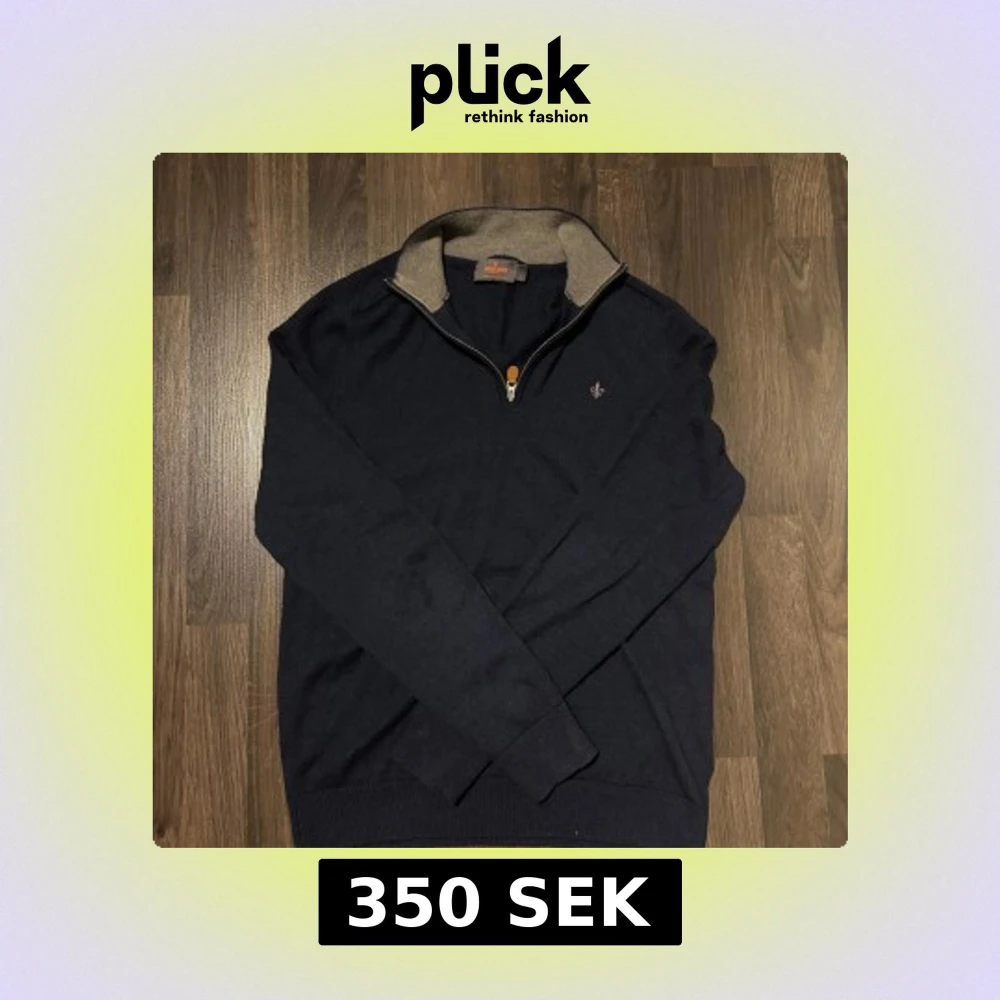 Säljer en stilren mörkblå tröja från Morris i 100% merinoull. Tröjan har en dragkedja framtill och en kontrasterande krage i beige. Perfekt för kyligare dagar och ger en elegant touch till din outfit. Storlek L men passar bättre M.
