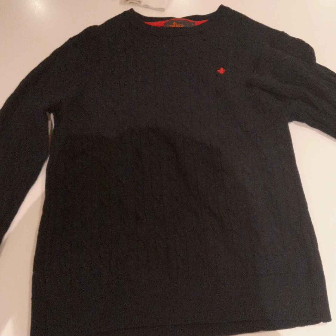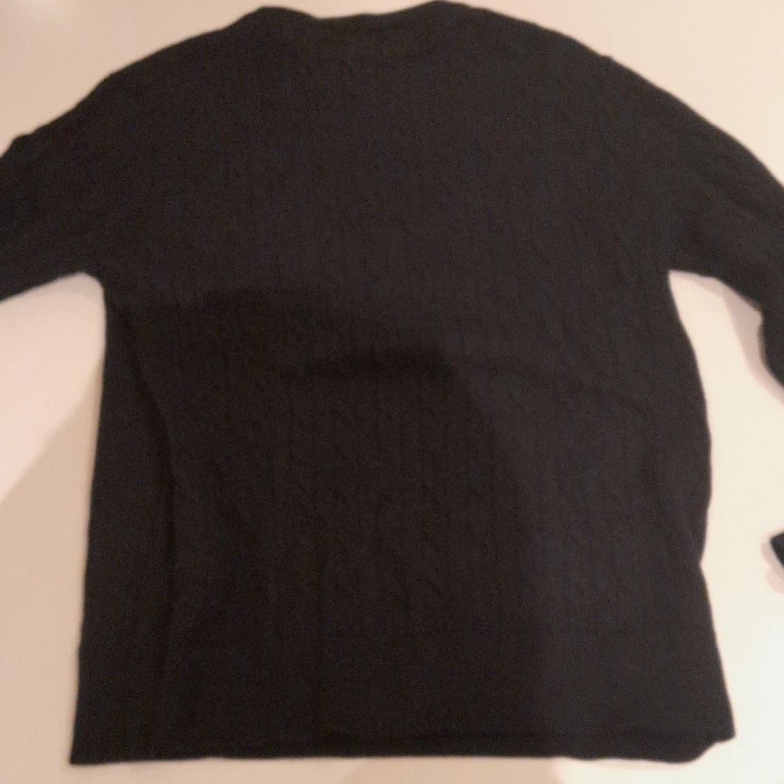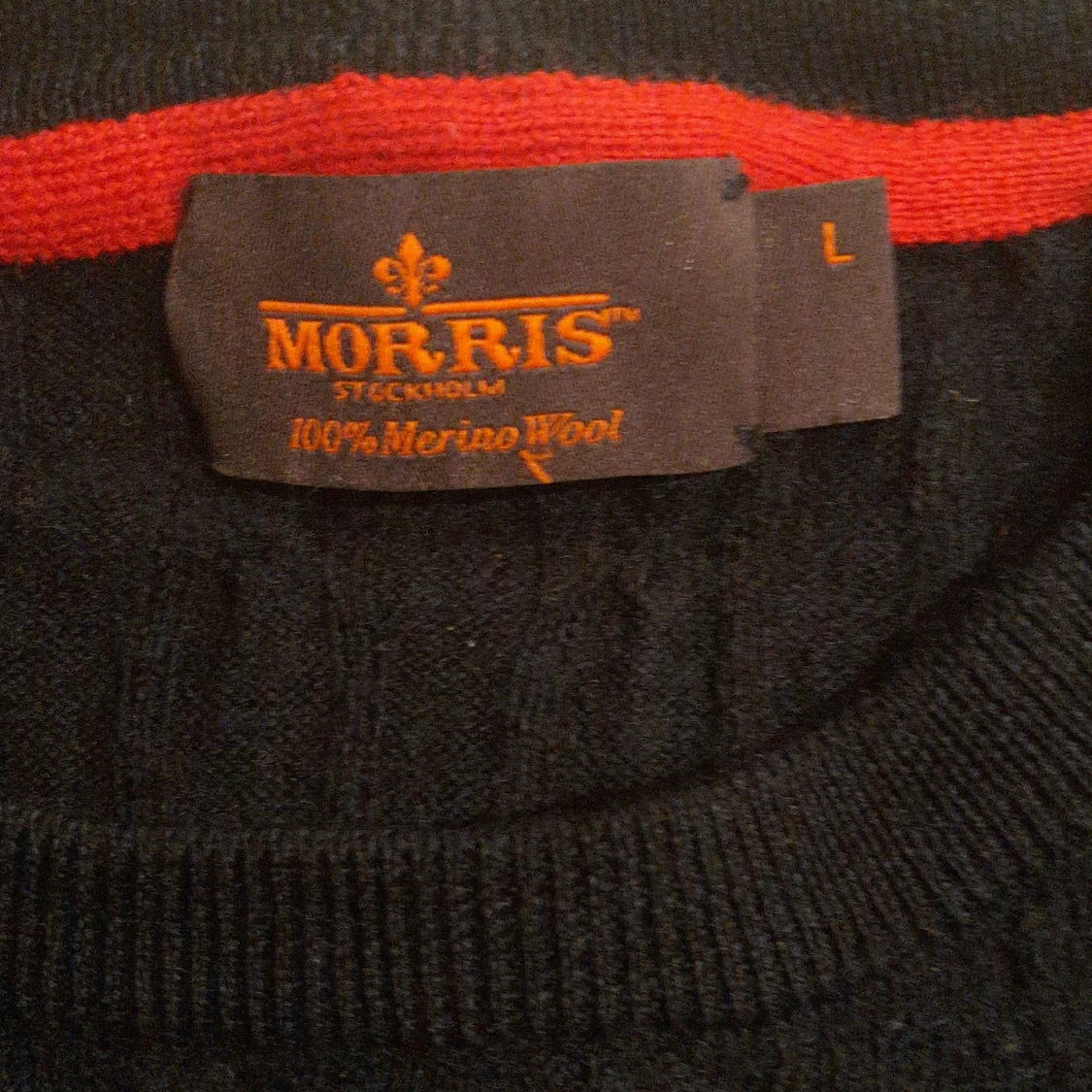 Svart kabelstickad tröja från Morris i 100% merinoull. Klassisk modell med rund halsringning och diskret röd logga broderad på bröstet. Perfekt för dig som gillar stilrena och tidlösa plagg med premiumkänsla.