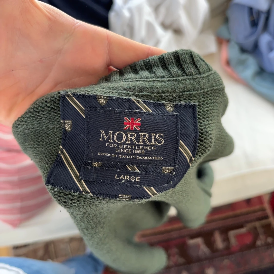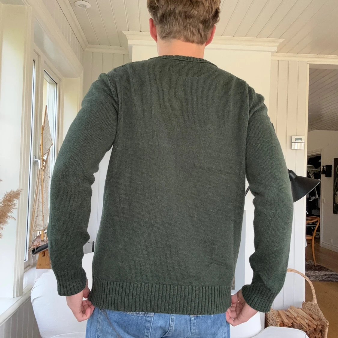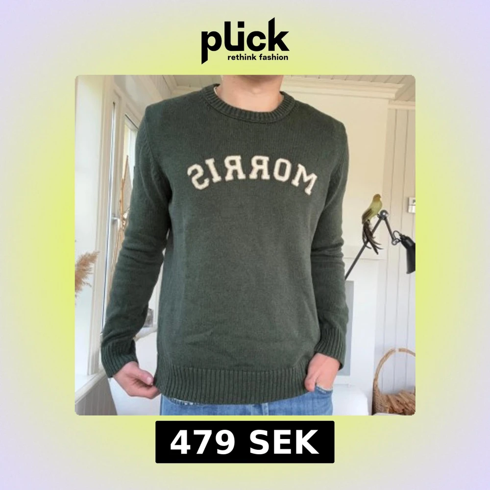 Mörkgrön stickad tröja från Morris med rund halsringning och vit broderad logga framtill. Tröjan har ribbade muddar vid ärmslut och nederkant, perfekt för dig som gillar klassisk och stilren look.