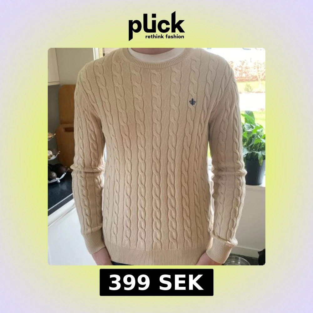 Säljer en stilren beige kabelstickad tröja från Morris i 100% bomull. Tröjan har en broderad logotyp på bröstet och ribbade muddar vid ärmslut och nederkant. Perfekt för en klassisk look!