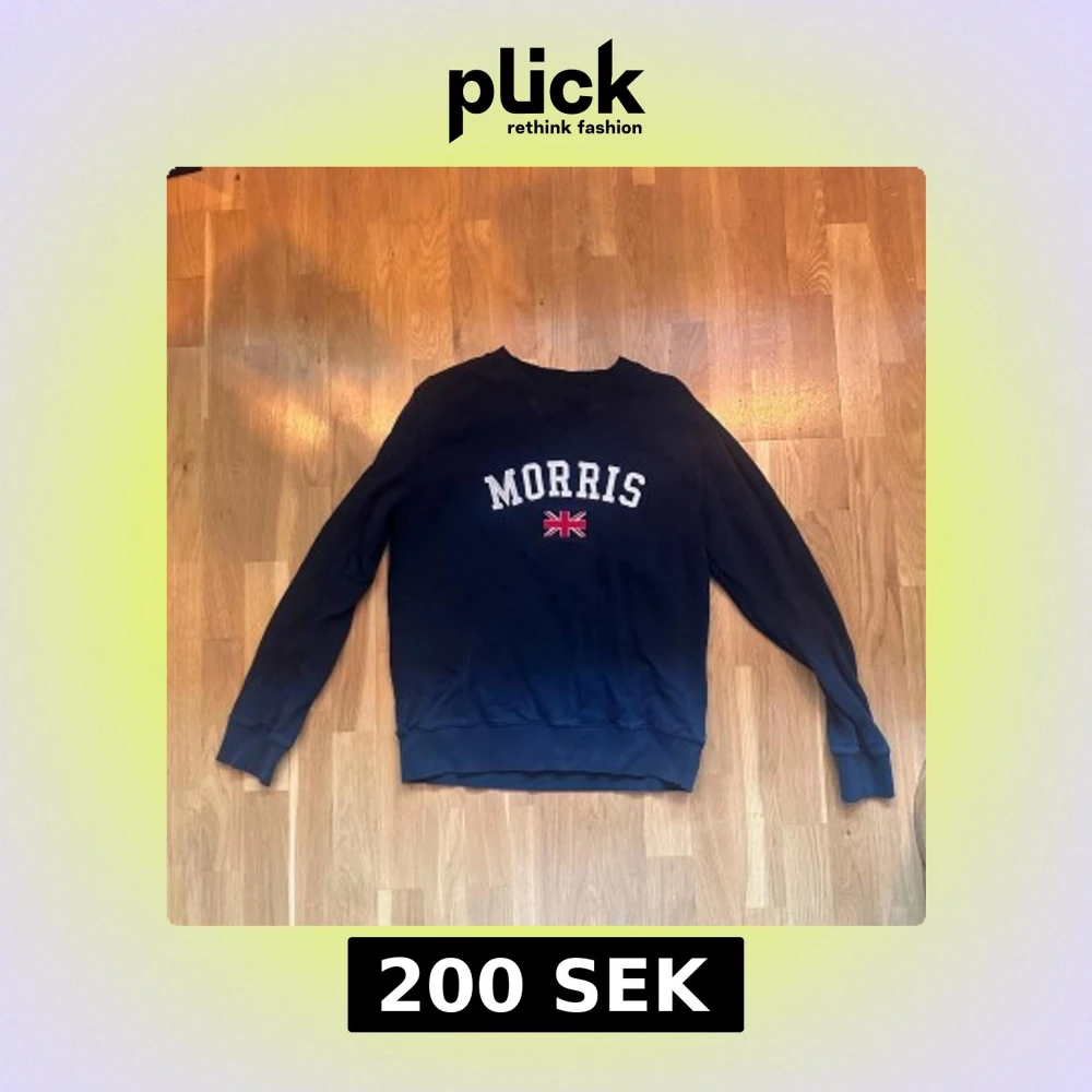 Snygg mörkblå sweatshirt från Morris med vit broderad logga och brittisk flagga framtill. Klassisk rund halsringning och långa ärmar.