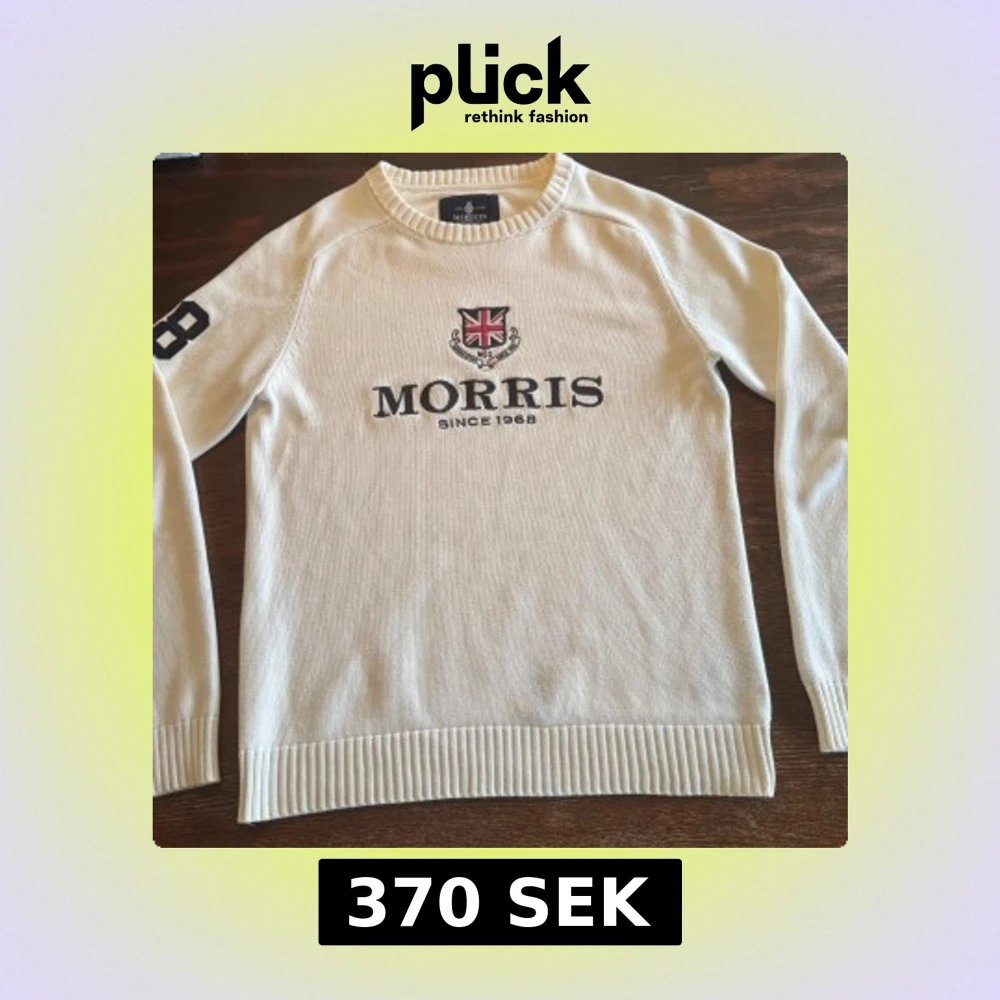 Snygg vit stickad tröja från Morris med broderad logga och brittisk flagga på bröstet. Tröjan har ribbade muddar, rund hals och svarta siffror på ena ärmen. Perfekt för dig som gillar klassisk och stilren design.