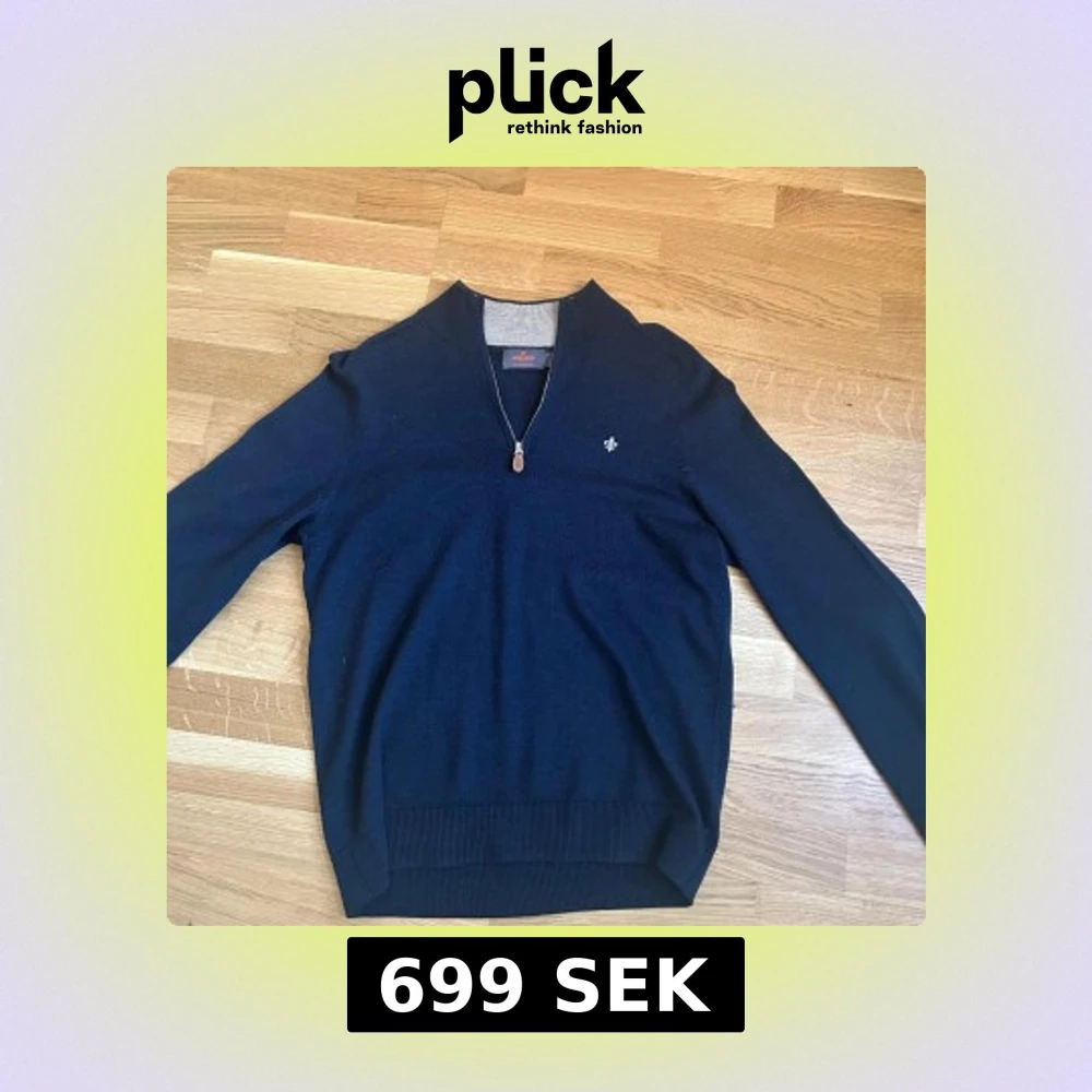Säljer en stilren mörkblå tröja från Morris i 100% merinoull. Tröjan har en dragkedja vid halsen och ett litet broderat emblem på bröstet. Tröjan är storlek M men skulle passa en S Kom med frågor. Priset är ej hugget i sten!!