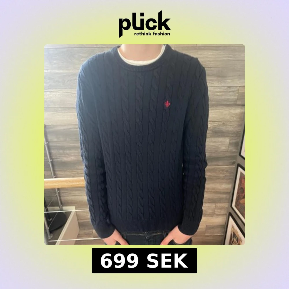 Säljer en snygg mörkblå stickad tröja från Morris med kabelstickat mönster. Tröjan har en broderad röd logga på bröstet. Tröjan är i nyskick, utan ett enda märke, hål eller defekt. Den verkar vara ganska liten för sin storlek. Modell: ≈ 178 cm. Skick:10/10, Storlek: S/M, Nypris: ≈ 1699 kr. Vid eventuella frågor eller annat, hör av dig!