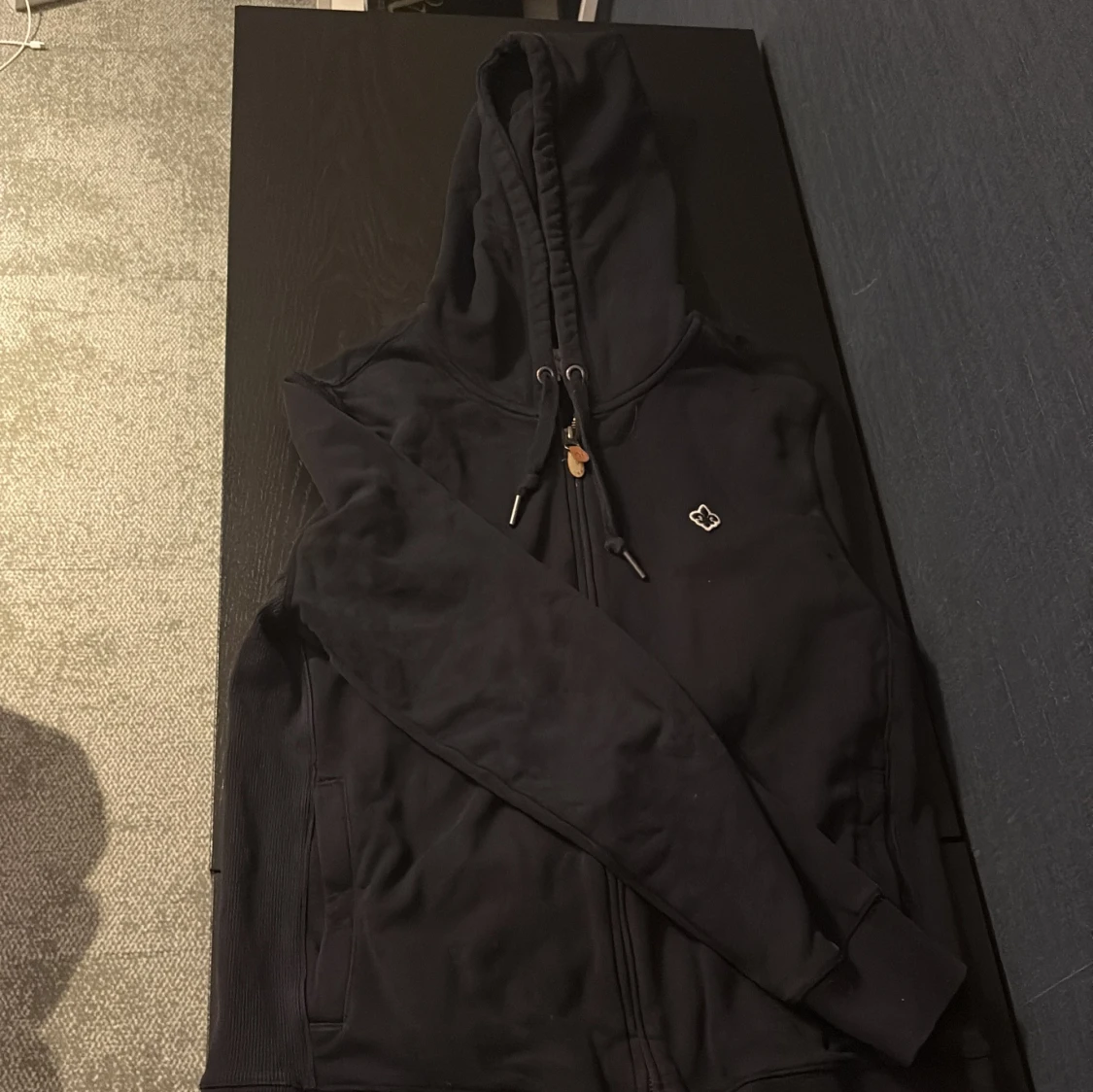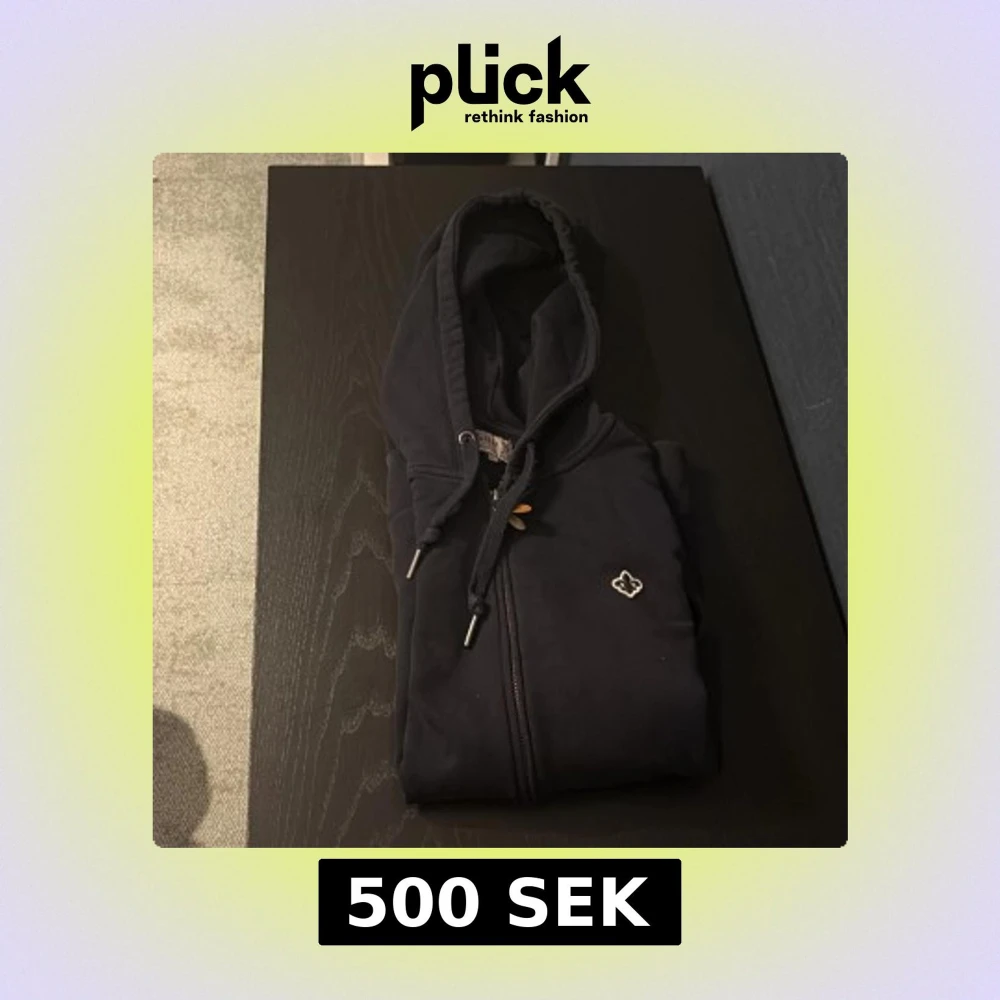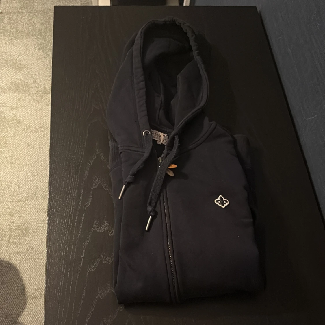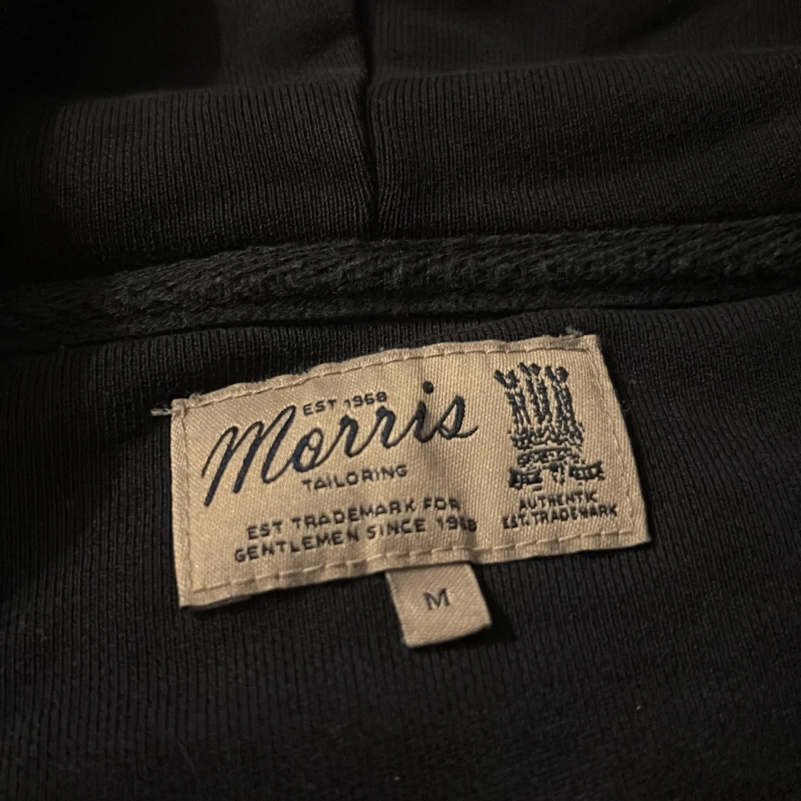Mörk blå hoodie från Morris i storlek M med dragkedja och huva. Tröjan har snörning i halsen, ribbade muddar och en broderad logga på bröstet. Perfekt för dig som gillar stilrena och klassiska plagg med snygga detaljer.