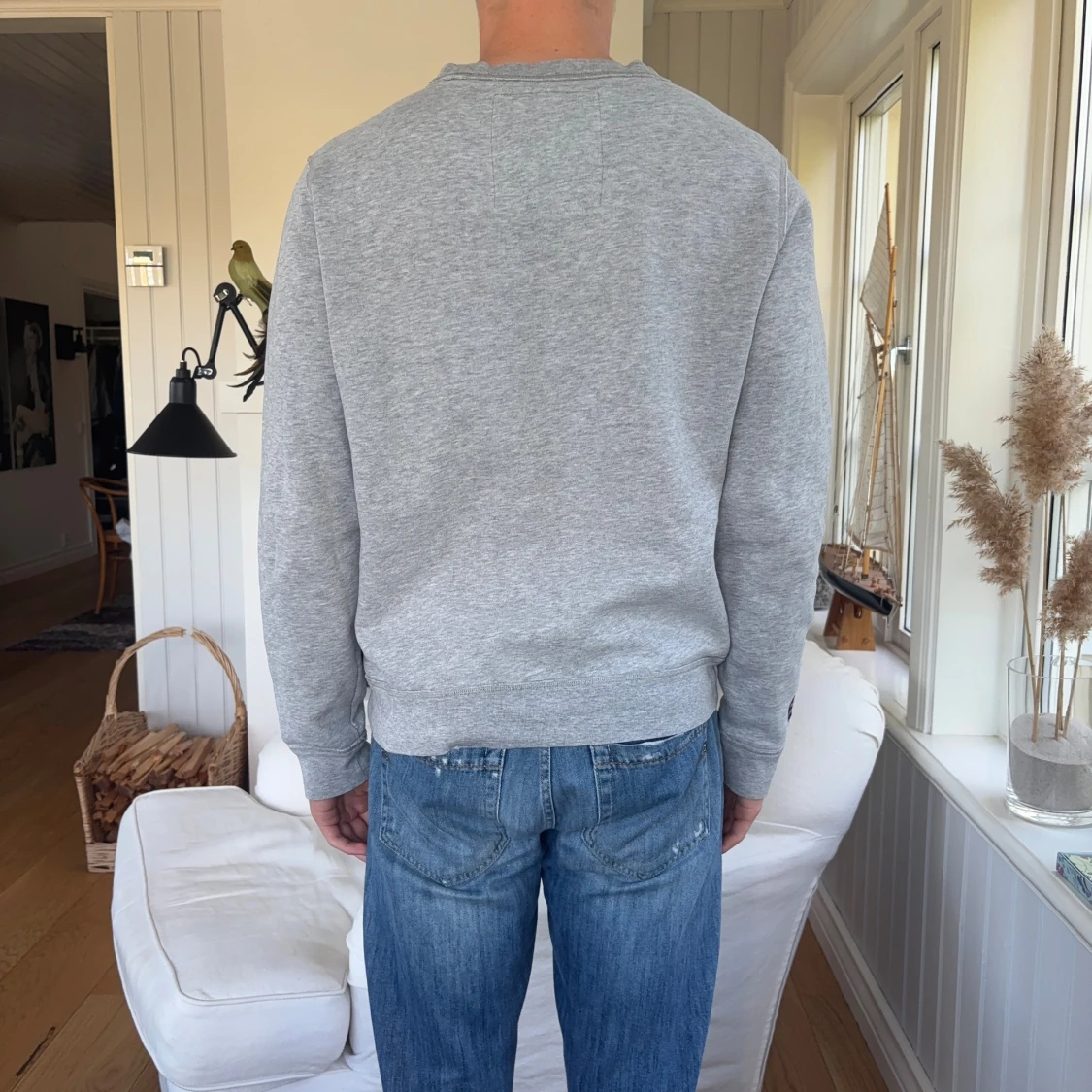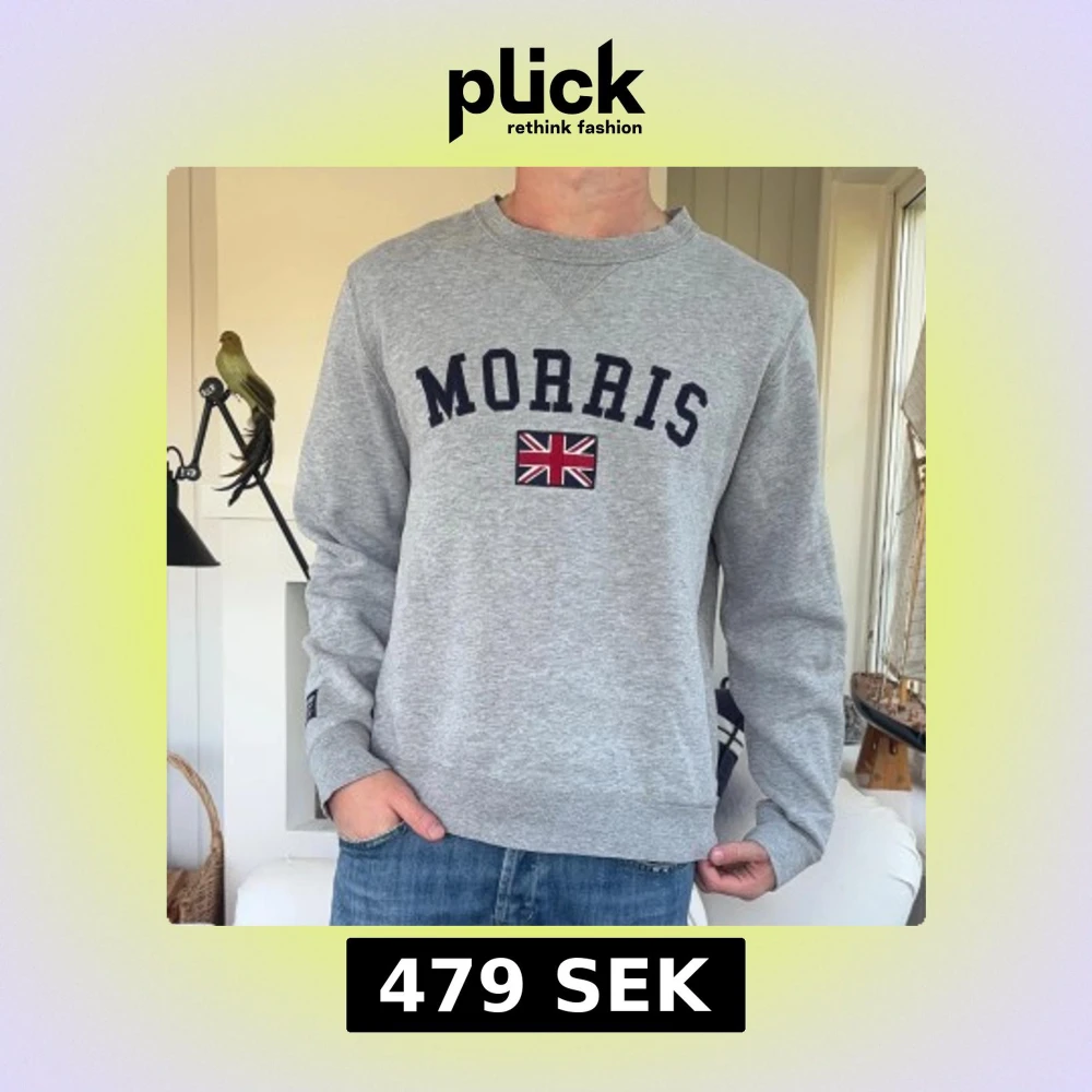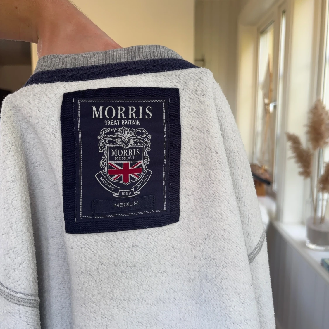 Grå sweatshirt från Morris med mörkblå text och brittisk flagga broderad på bröstet. Klassisk rund halsringning och långa ärmar. Tillverkad i mjuk bomullsmix, perfekt för en avslappnad stil.