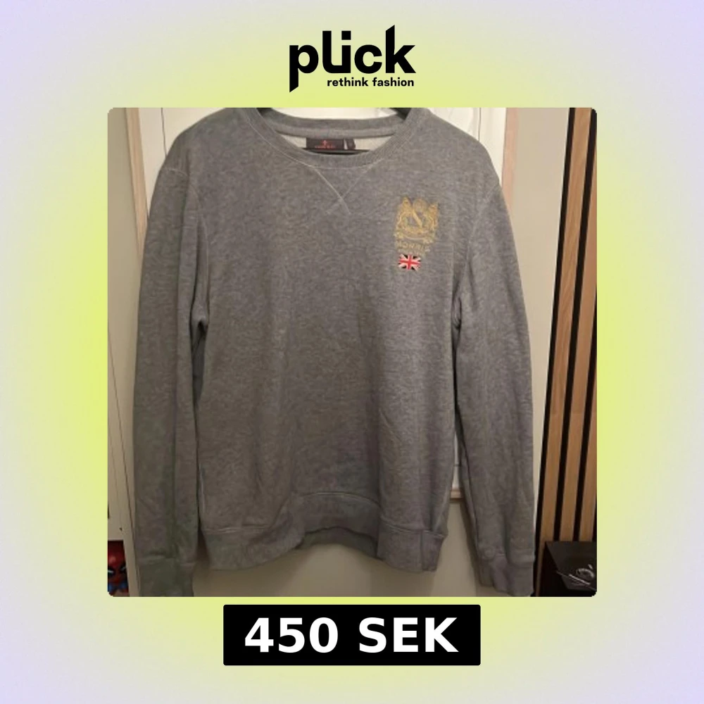 Grå sweatshirt från Morris med broderat guldemblem och brittisk flagga på bröstet. Klassisk rund halsringning och ribbade muddar. Perfekt för en stilren och avslappnad look. Tröjan är i storlek M men passar S bra med. Tröjan är inprinsip aldrig använd då jag inte är så förstjust i dessa form av tröjor.