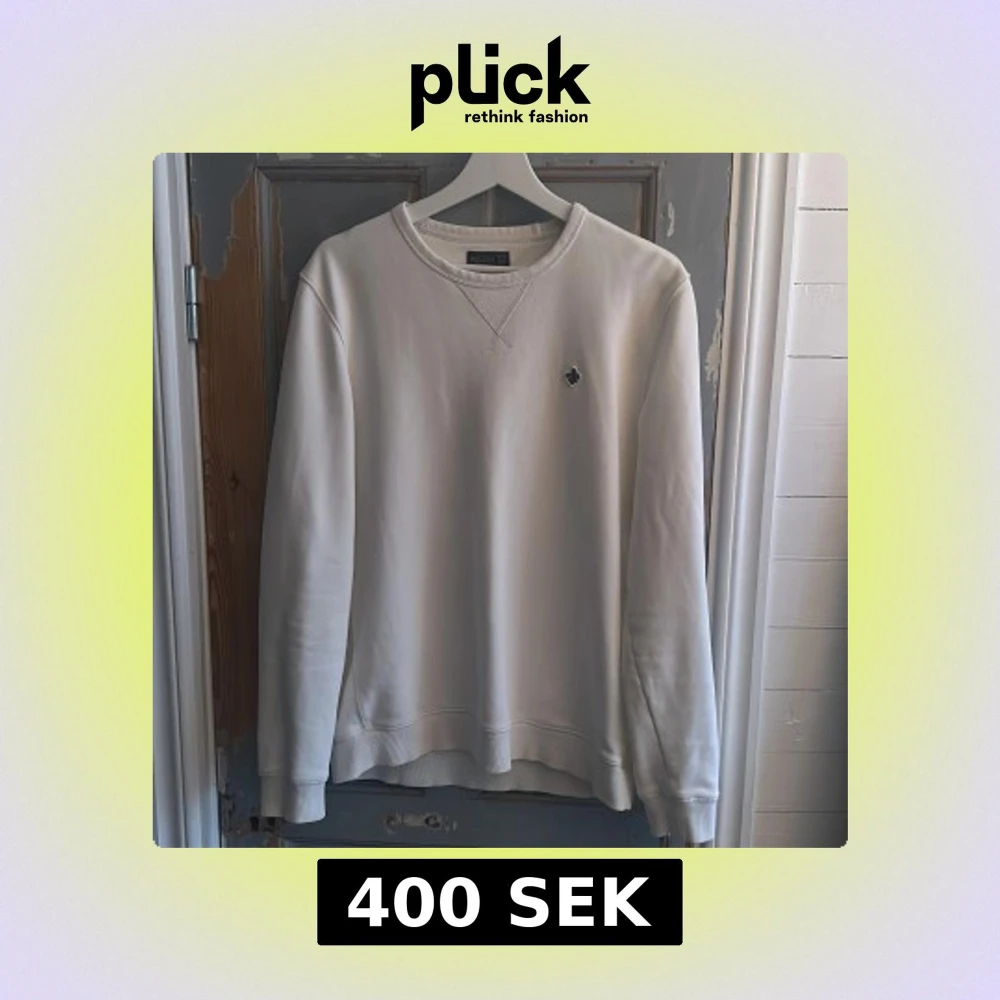Säljer en stilren vit sweatshirt från Morris med rund hals och ett litet broderat emblem på bröstet. Tröjan har långa ärmar och ribbade muddar vid ärmslut och nederkant. Perfekt för en avslappnad look.