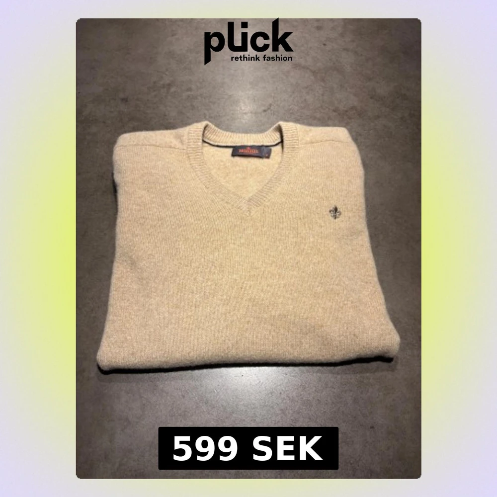 Snygg beige Merinoull stickad tröja från Morris med v-ringad hals och vita mockadetaljer på armbågarna. Riktigt varm och skön tröja. Storlek : M. Skriv vid frågor eller kom med bud!