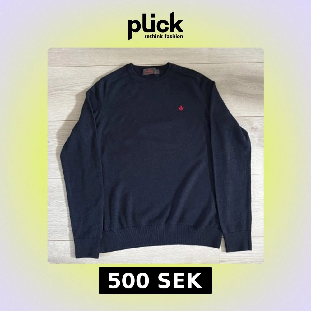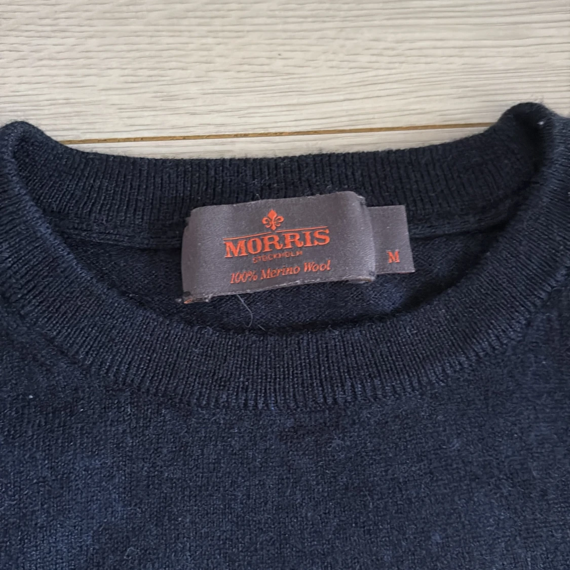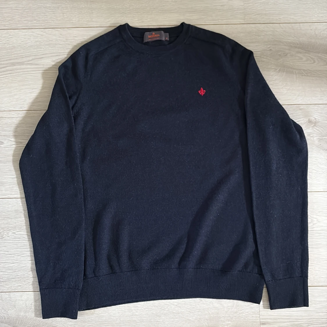 Klassisk marinblå tröja från Morris i 100% merinoull. Rund halsringning, ribbade muddar och en liten röd broderad detalj på bröstet. Perfekt för lager-på-lager och riktigt skön att ha på sig under kyliga dagar. Storlek M men sitter som en S. Kvitto finns vid behov!