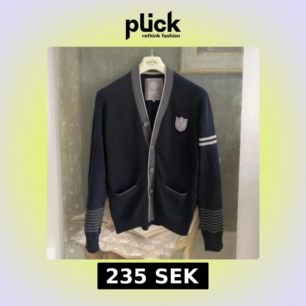 Mörkblå kofta från Morris med grå knappar och kant, emblem på bröstet och två fickor fram. Grå ränder på ena ärmen och vid ärmsluten samt bruna armbågslappar. Perfekt för en stilren och sportig look.