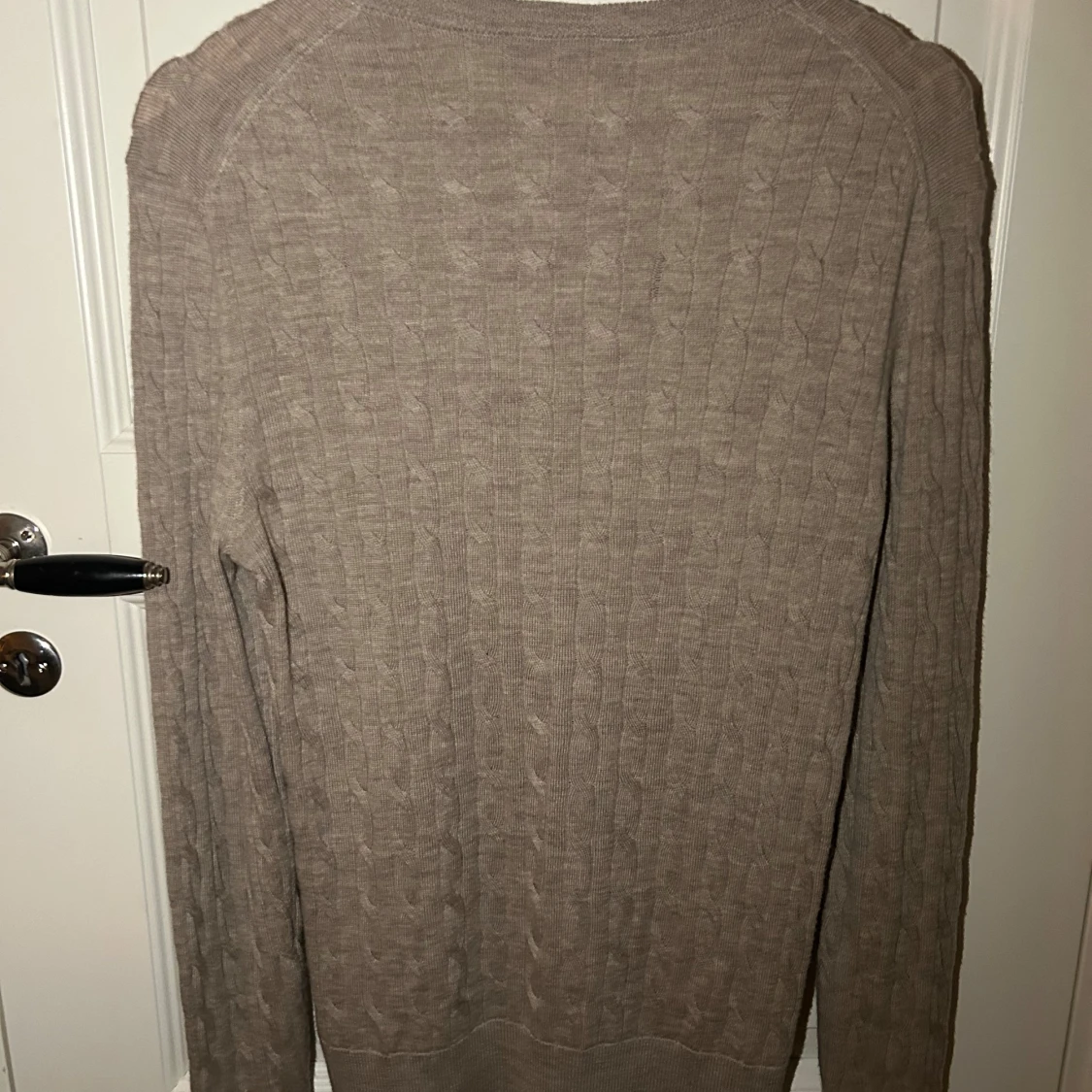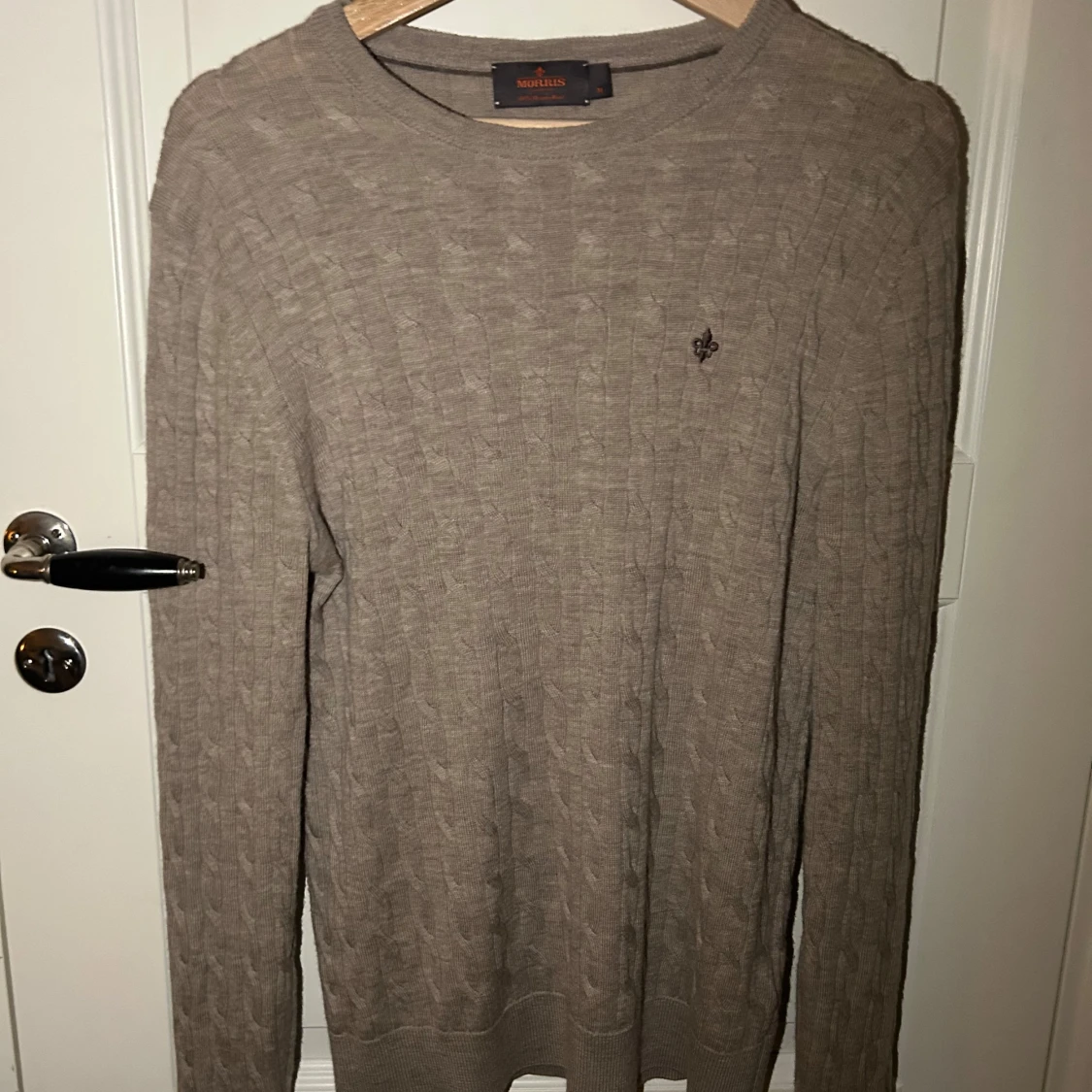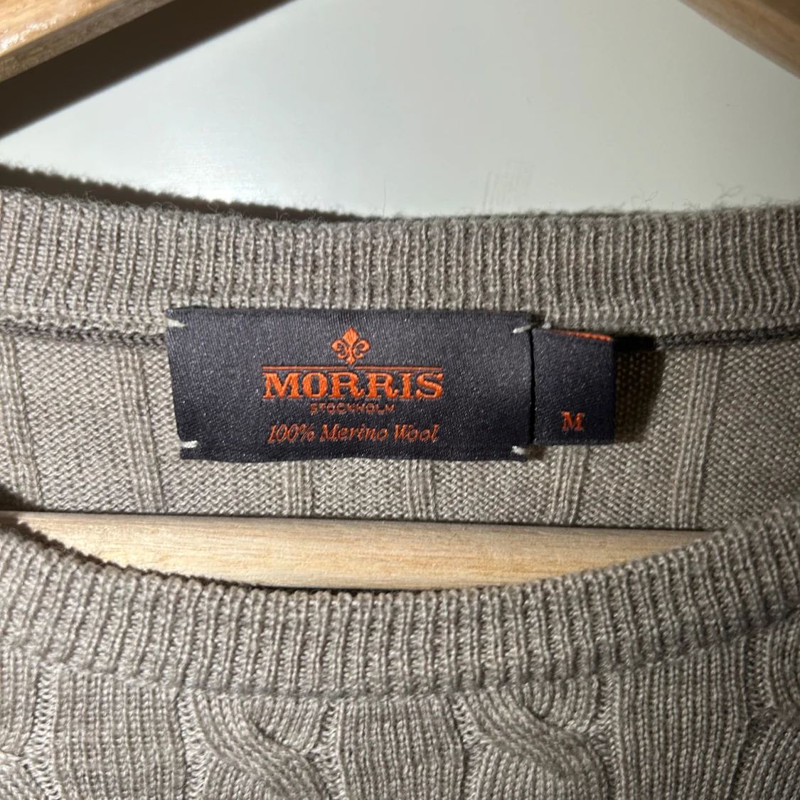 Säljer en stilren beige kabelstickad tröja från Morris i 100% merinoull. Liten defekt på baksidan(bild nr 4) utöver det är den som ny(använd kanske 10 gånger) extra tråd medföljer även(bild 5) ifall man skulle vilja sy den eller lämna till en skräddare. Str. M men skulle även kunna passa S