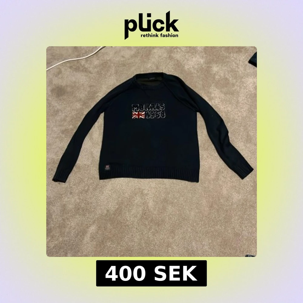 Snygg mörkblå stickad tröja från Morris med tryck på framsidan, storlek M