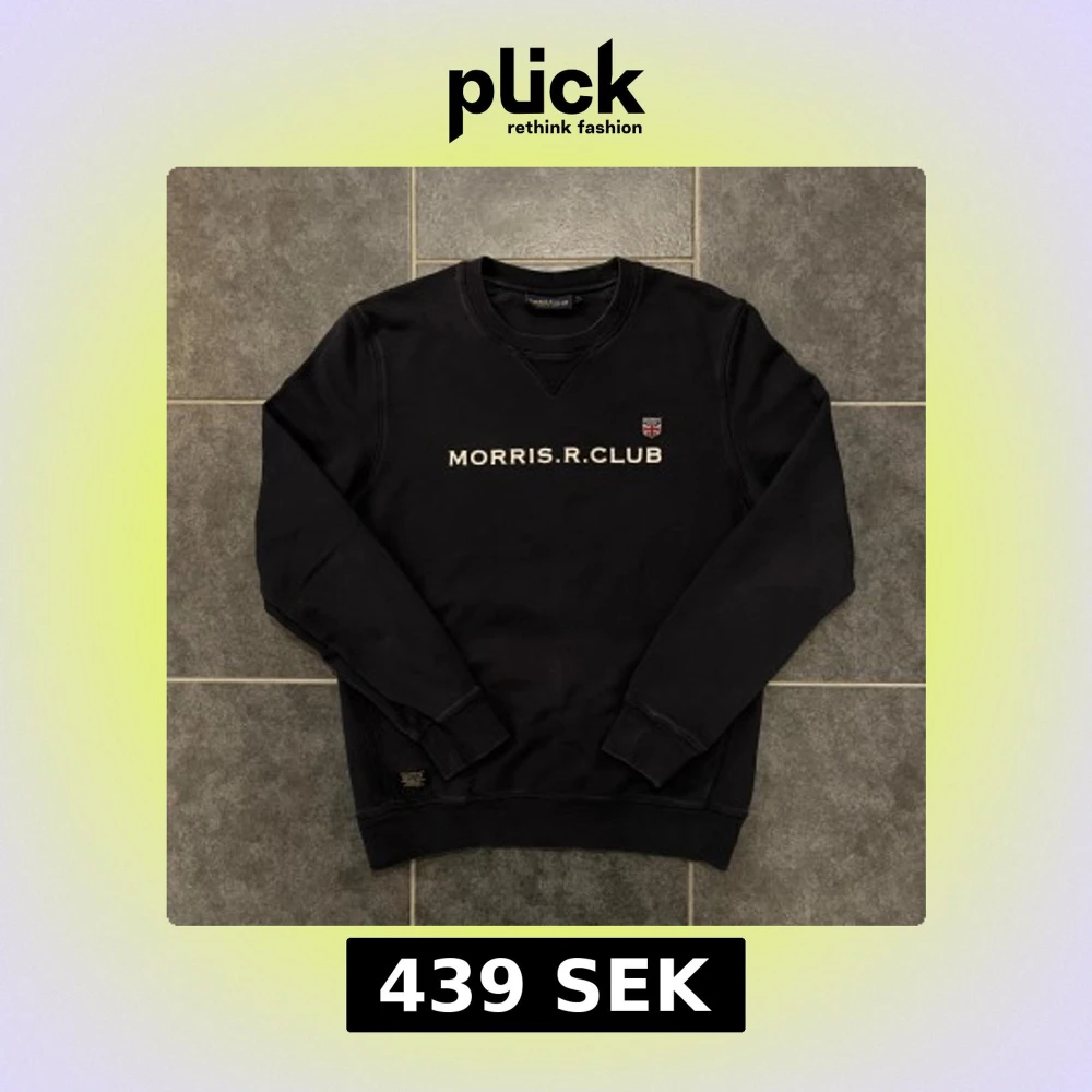 Säljer en svart sweatshirt från Morris R. Club med tryckt logga på bröstet och liten broderad detalj. Tröjan har rund halsringning och långa ärmar. Perfekt för en stilren och avslappnad look.