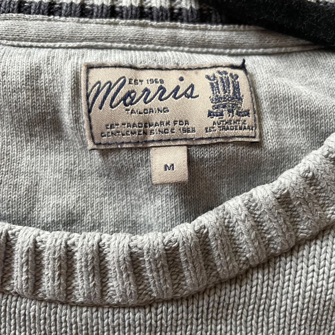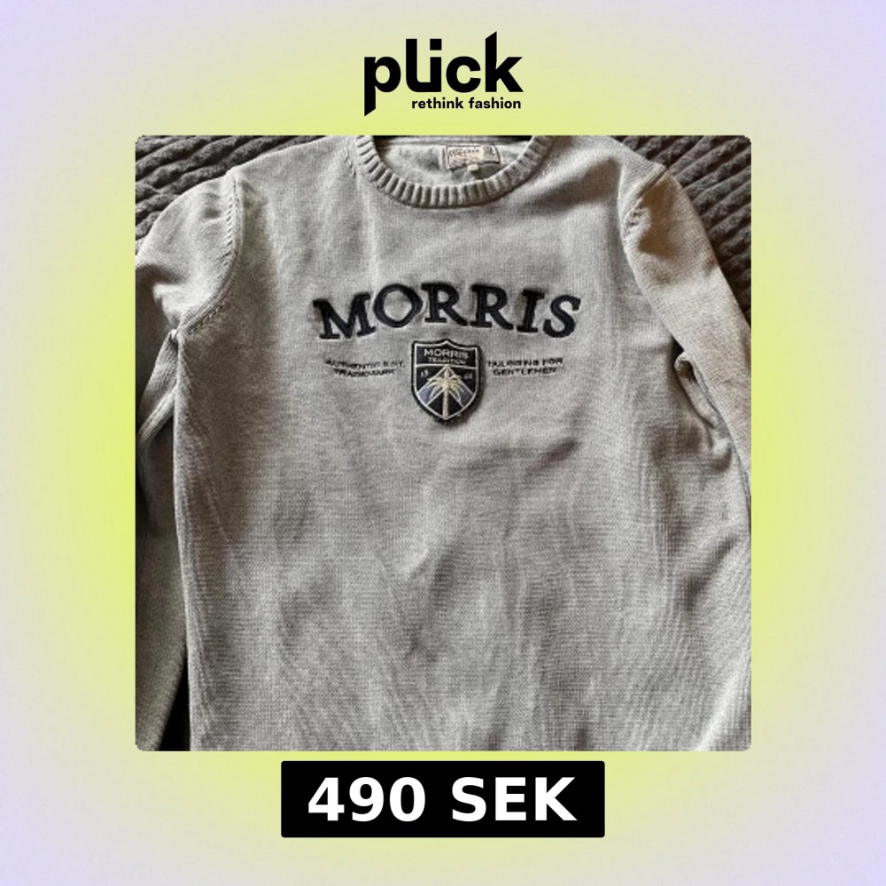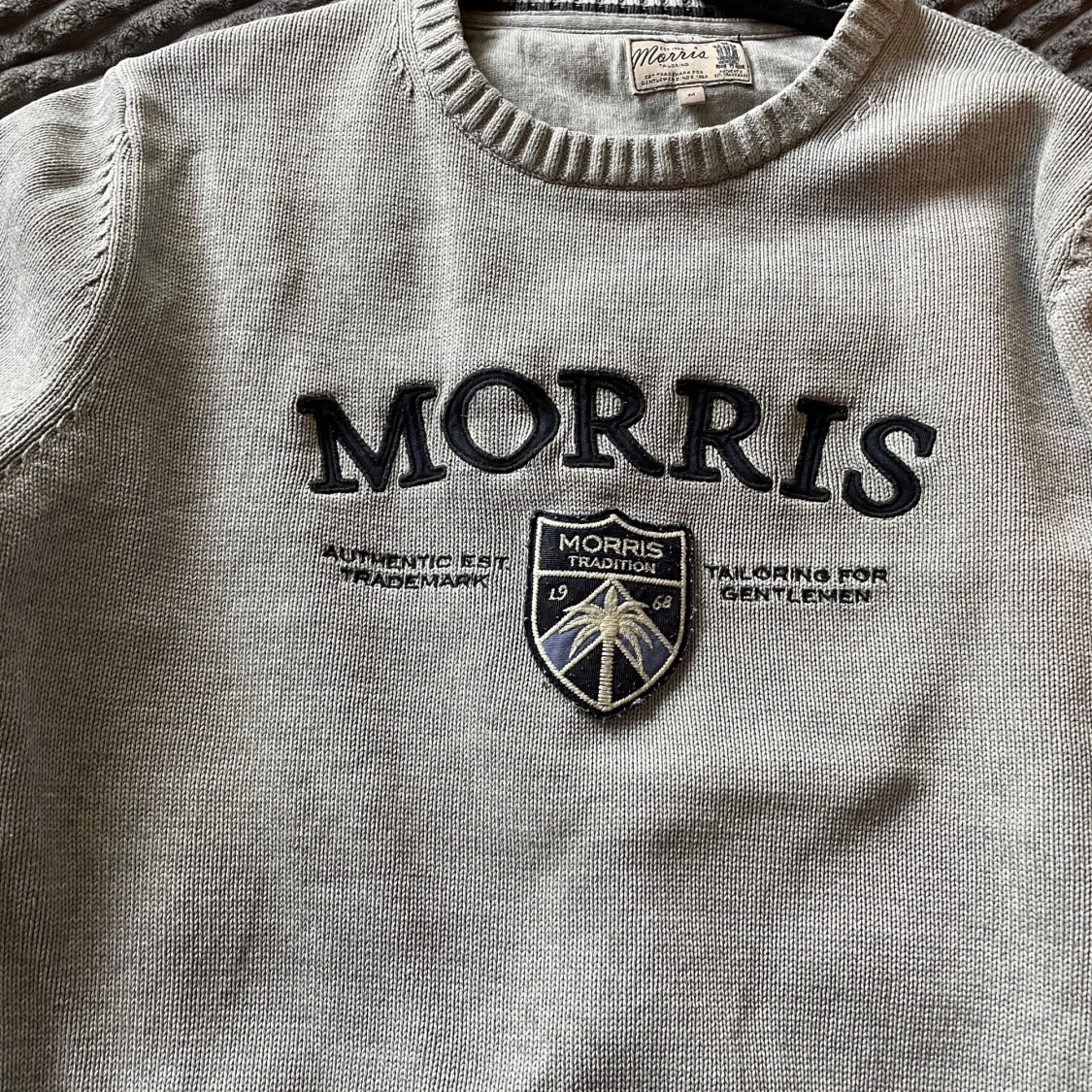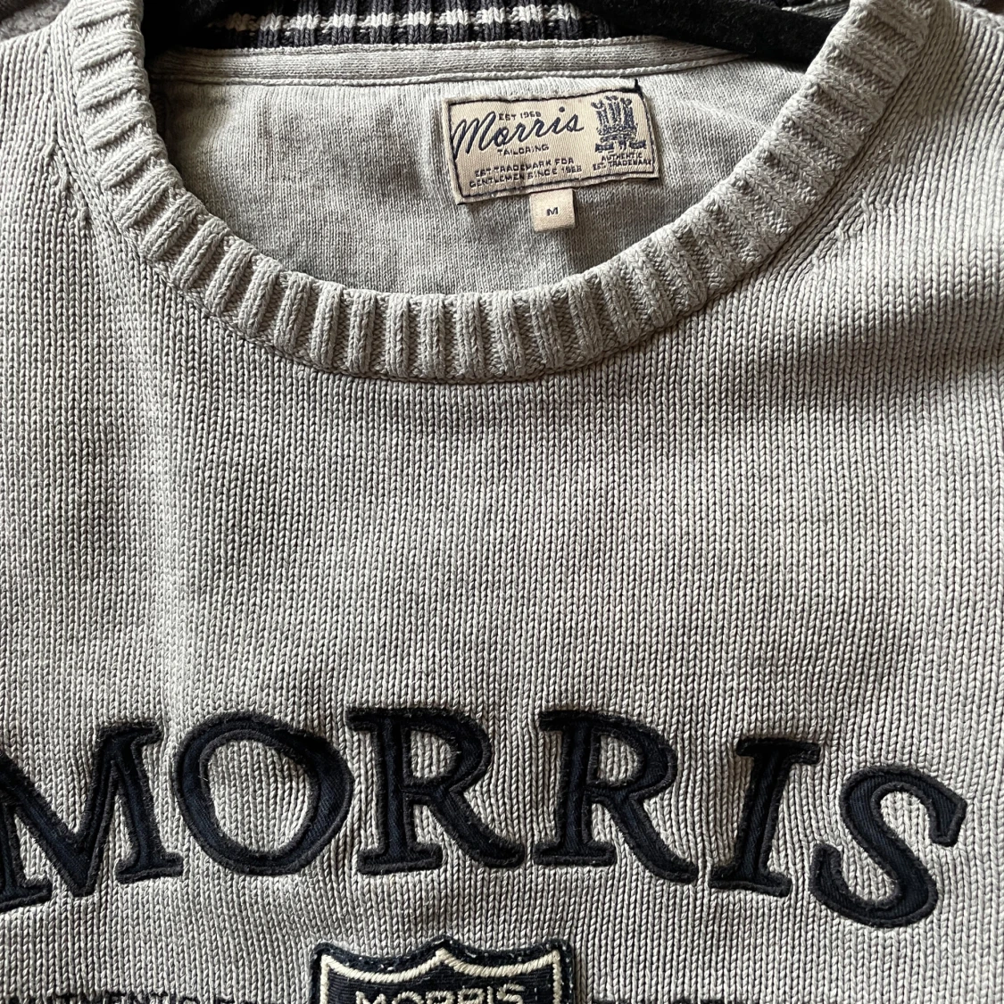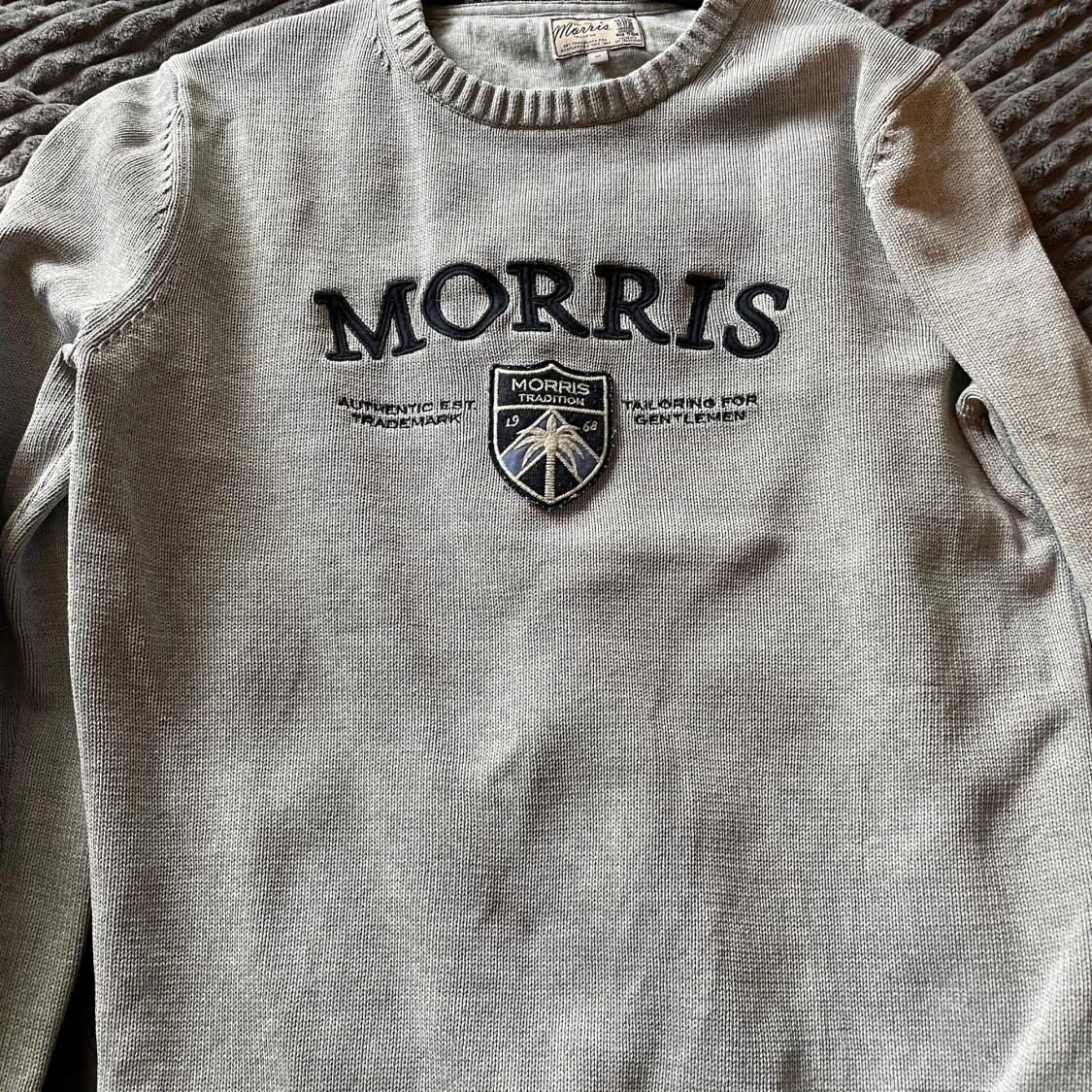 Säljer en grå stickad tröja från Morris med broderad logga och emblem på bröstet. Tröjan har rund halsringning och långa ärmar. Perfekt för dig som gillar klassisk och stilren design med en sportig touch.